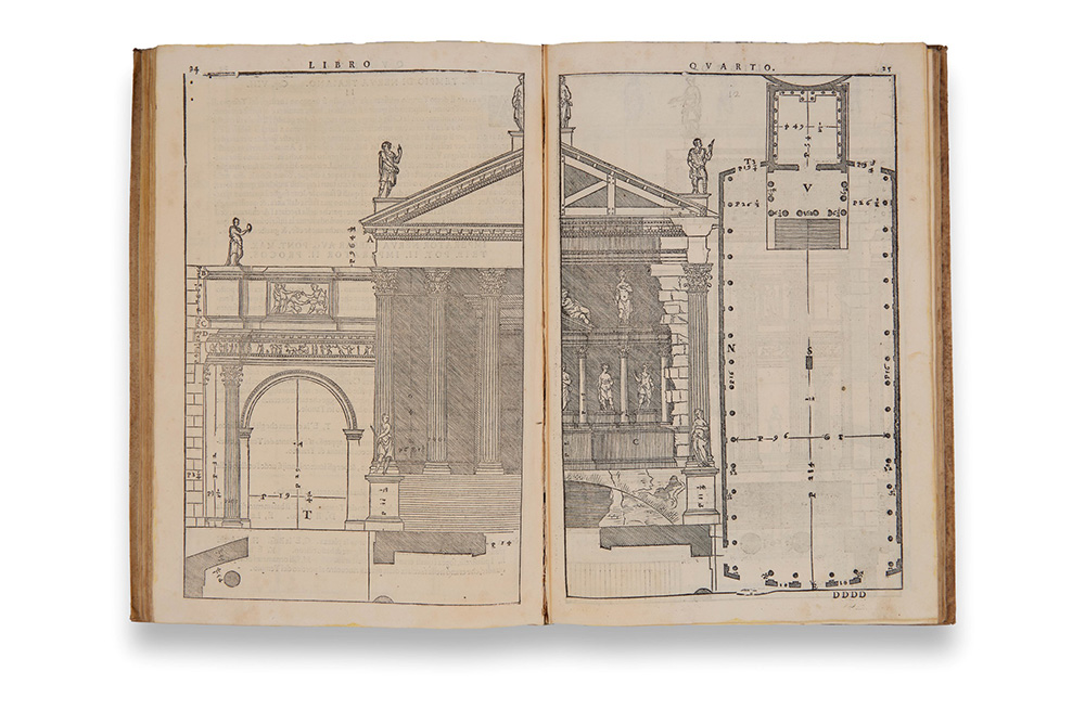 PALLADIO, Andrea (1508-1580). I Quattro Libri dell'Architettura. Venezia: Bartolomeo Carampello, 1581. Seconda edizione in buono stato di conservazione di questo fondamentale trattato di architettura pubblicato per la prima volta a Venezia nel 1570. Questa edizione è praticamente identica alla prima sia per il testo che per le straordinarie illustrazioni e la stampa è stata supervisionata dal figlio di Andrea Palladio, Silla. Folio (305 x 205mm). Titolo di ogni libro riccamente illustrato, numerose xilografie anche a piena e doppia pagina, con tutte le carte bianche (piccola riparazione al margine alto di 2G3, traccia di tarlo al margine di 3F1-3F4 e 4A1-4K2 con piccole perdite). Vitello coevo con titolo al dorso (fogli di guardia moderni). Provenienza: BG e LB (piccoli timbri sull’ultima carta). A fine copy of the second edition of Palladio’s famous work which was first published in 1570 in Venice. Numerous woodcut illustrations, with all the blanks (minor repair to top margin of 2G3, small wormhole to 3F1-3F4 and 4A1-4K2 with minor loss). Contemporary vellum (new endpapers). Provenance: BG and LB (small stamps on final leaf).