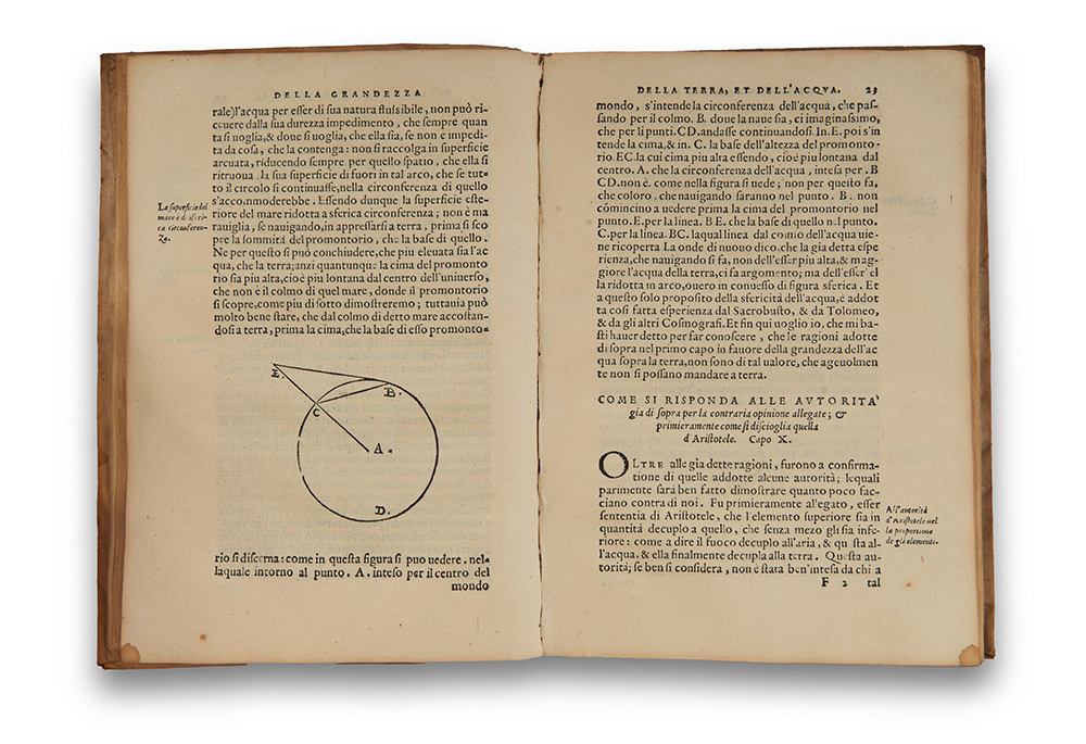 PICCOLOMINI, Alessandro (1508-1578). Della grandezza della terra et dell'acqua. Venezia: Giordano Ziletti, 1561. [Legato con:] Antonio BERGA (c.1535-1580). Discorso...della grandezza dell'acqua e della terra. Torino: eredi del Bevilacqua, 1579. [E:] Giovanni Battista BENEDETTI (1530-1590). Consideratione...d'intorno al discorso della grandezza della terra, e dell'acqua. Torino: eredi del Bevilacqua, 1579. Interessante raccolta di trattati sull’acqua e sulla terra. 3 opere in un volume, 4to (198 x 140mm). Marche tipografiche incise in rame (lievi macchie di umidità). Legatura coeva in pergamena, titolo manoscritto al dorso (alcuni piccoli fori di tarlo e macchie di umidità). Provenienza: firma illeggibile al frontespizio. 3 works in one volume. An interesting collection of treatises on water and earth. Woodcut printer’s devices (light waterstaining). Contemporary vellum (few small wormholes and light waterstaining). Provenance: illegible inscription on title.