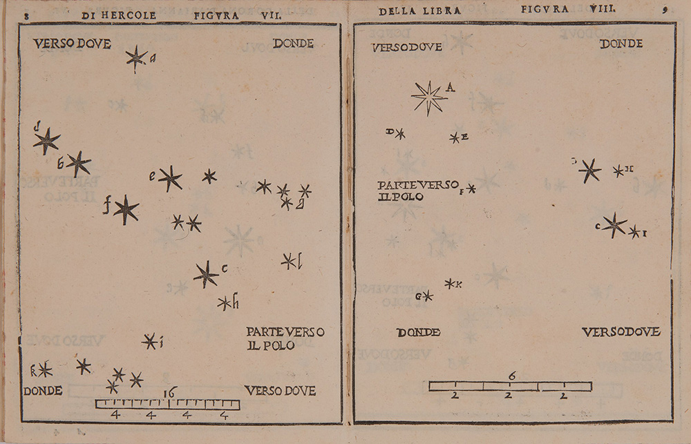 PICCOLOMINI, Alessandro (1508-1579). La Sfera del Mondo. Venezia: Giovanni Varisco e Compagni, 1579. [Legato con:] De le Stelle Fisse. Venezia: Giovanni Varisco e Compagni, 1579. Tra i più apprezzati e diffusi trattati astronomici del Cinquecento; De le Stelle Fisse è considerato il primo atlante celeste pubblicato in occidente. 2 testi in un volume, 4to (192 x 150mm). Marca tipografica ai frontespizi e numerose illustrazioni xilografiche nel testo (piccoli fori di tarlo al primo titolo e prime pagine, alcuni riparati). Non rilegato, tagli marmorizzati. Important astronomical treatise. De le Stelle Fisse is considered the first star atlas published in the West. Riccardi I, 270. (Small wormholes on title and first few leaves, some repaired). Unbound.