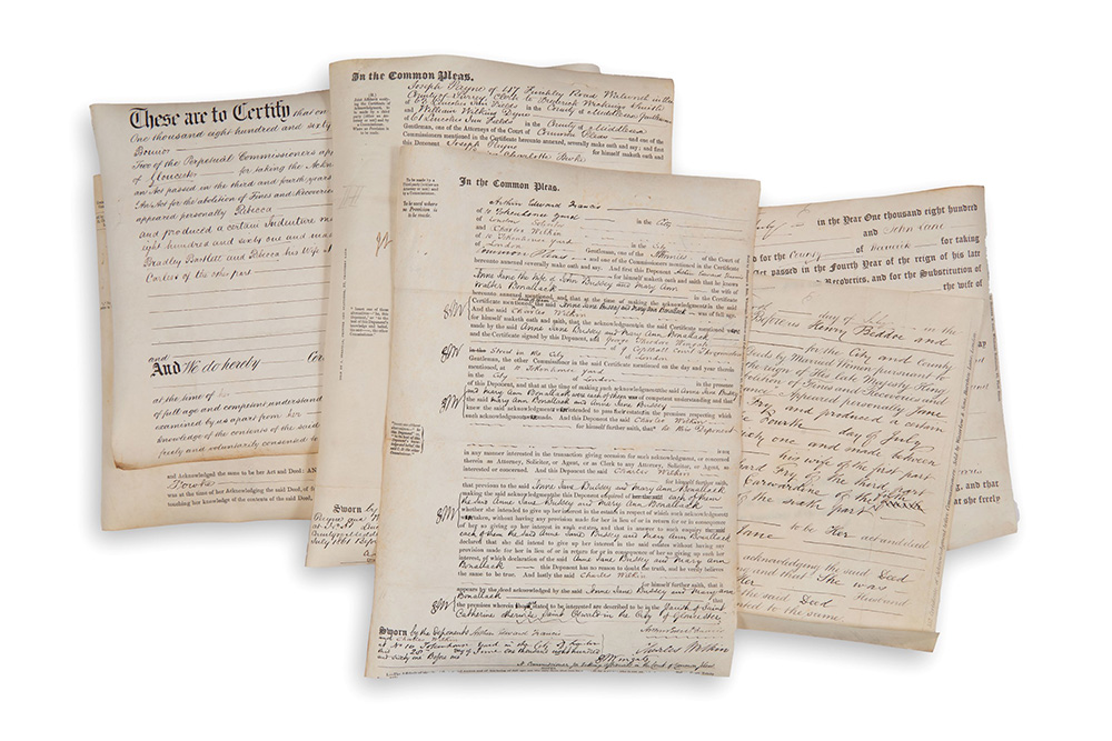 [CERTIFICATI - LINGUA INGLESE]. Collezione di undici certificati di riconoscimento di un atto notarile da parte di una donna sposata del 1861 circa. Inghilterra, 1861 circa. In lingua inglese. Certificati notarili dal profondo interesse storico-culturale, relativi ai diritti delle donne sposate inglesi sui propri averi. I primi certificati di questo tipo sono del 1833 e talvolta si trovano allegati al corrispondente atto notarile. La loro finalità era evitare che una donna, una volta sposata, perdesse ogni diritto sui propri beni, e che questi passassero automaticamente al marito. La clausola del 1833 del Fine and Recoveries Act prevedeva che una donna sposata venisse intervistata da un pubblico ufficiale (il commissioner) in separata sede dal marito per appurarne la maggiore età e la reale comprensione del contenuto, in modo da confermare che la donna non venisse obbligata alla vendita contro la sua volontà. Dal 1882, con il Married Women's Property Act, vennero finalmente garantiti pari diritti sulle proprietà delle moglie e di conseguenza terminò la produzione di questi certificati. Questi 11 certificati sono databili al 1861 circa e coinvolgono varie coppie di sposi, fra cui quella di Charlotte e Francis Fowke (1823-1865), ingeniere e architetto della Royal Albert Hall e del Victoria and Albert Museum a Londra. These certificates, the earliest dating 1833, are sometimes found attached to the deed to which they refer. They were created as an attempt to right the property belonging to the wife which became the property of the husband, meaning she effectively lost all control over its disposition or sale. Despite a common law requirement that she be a party to the deed of sale, it was generally held that the husband’s will always prevailed and abuses of that position were thought to be common. In 1833 a clause in the Fines and Recoveries Act required that a woman selling property jointly with her husband would have to be interviewed separately by a public official, known as a commissioner, to certify that she was ‘of full age and competent understanding’, to confirm that she was not being forced into agreeing to the sale.The Married Women’s Property Act of 1882 finally granted equal rights in property ownership to married women and simultaneously brought to an end the production of the certificates of Acknowledgement.