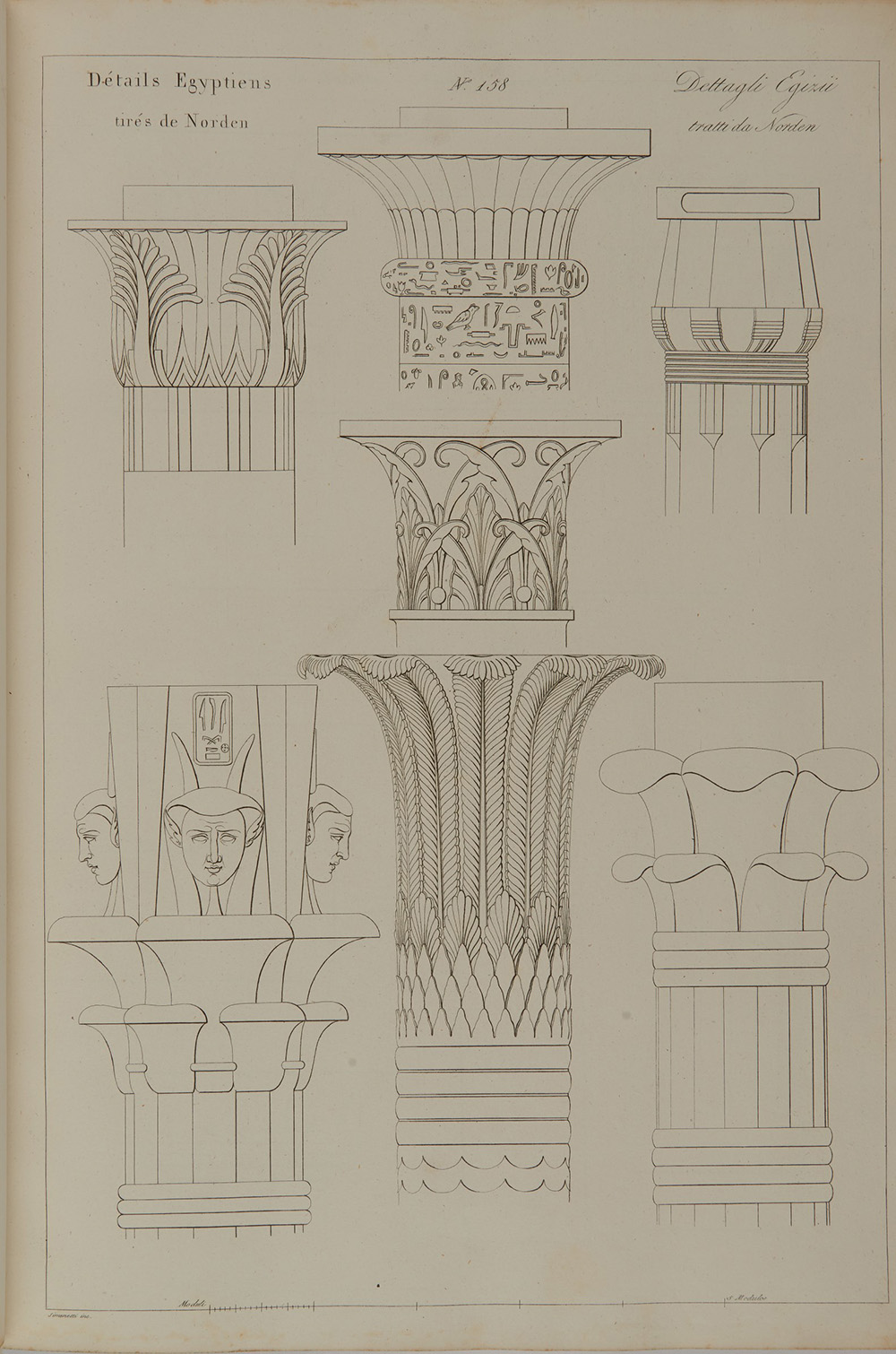 DURAND, Jean Nicolas Louis (1760-1834). Raccolta e Parallelo delle Fabbriche Classiche di tutti i tempi d'ogni popolo e di ciascun stile con l'aggiunta di altre 300 e più fabbriche e monumenti d'ogni genere antichi e moderni e della storia generale dell'architettura di J.G. Legrand. Venezia: Giuseppe Antonelli 1834. Bell'edizione italiana del Durand completo di 266 tavole. 3 volumi, folio (468 x 327mm). Vignette incise in rame ai frontespizi, 266 tavole numerate dalla 1 alla 260 con tavole 36, 37, 59, 61, 106 e 143 bis (alcune occasionali pieghe e lievissime macchie). Legatura in mezza pelle coeva, tagli a spruzzo (qualche graffio e difetto). Provenienza: Giovanni Bertarelli (donato a:) -- Jean Ternier? (iscrizione datata 19 luglio 1857). A fine edition complete with 266 plates. (Occasional creases and light staining). Contemporary half calf, speckled edges. Provenance: Giovanni Bertarelli (gift to:) -- Jean Ternier? (inscription dated 19 July 1857).