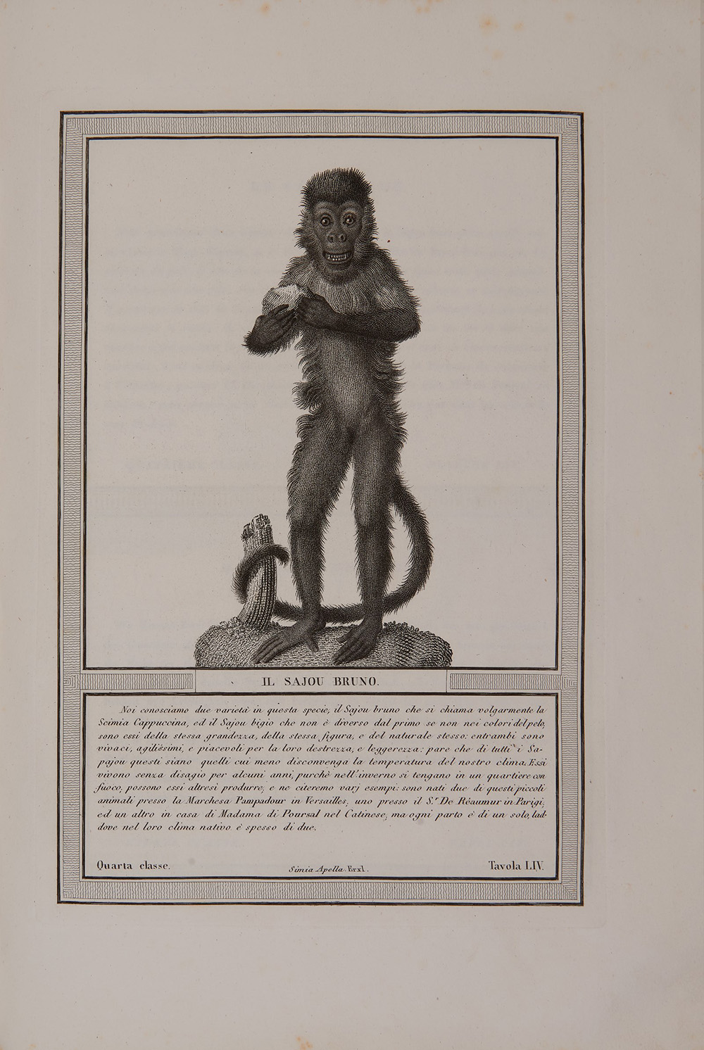 JACOB, Nicolas Henri (1782-1871) - Pietro HUGUES. Storia e delle Scimie e dei Maki. Milano: P. Hugues, 1823. Buona copia di questo importante lavoro sia dal punto di vista delle scienze naturali che da quello tipografico. Con 89 tavole incise da Nicolas Henri Jacobs raffiguranti scimmie e maki. Folio (403 x 286mm). Frontespizio inciso in rame e inquadrato in cornice architettonica, numerose tavole incise in rame di Nicolas Henri Jacobs fra cui: 4 tavole parte del discorso preliminare, 70 tavole raffiguranti scimmie del nuovo e vecchio continente divise in 5 classi, 15 tavole raffiguranti maki, sempre con testo annesso in cornice architettonica (strappo riparato alla tavola XII senza perdite). Mezza pelle coeva, piatti e tagli marmorizzati e spruzzati, titolo su etichetta in pelle al dorso (un po' sfregata). Provenienza: nota di possesso illeggibile al frontespizio. Cfr. Nissen,ZBI,2080 - Brunet,III,478 A fine copy of this important work with 89 engraved plates by Nicolas Henri Jacobs (repaired tear to plate XII without loss). Contemporary half calf, marbled edges and title on spine label (lightly rubbed). Provenance: illegible ownership inscription on title.