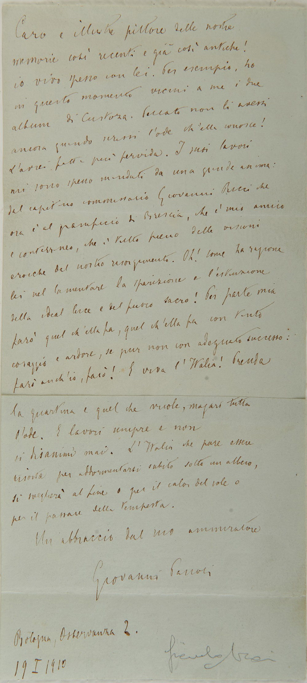 PASCOLI, Giovanni (1855-1912). Lettera autografa [indirizzata al pittore Quinto Cenni]. Bologna, 19 gennaio 1910. Ottima testimonianza della profonda ammirazione di Pascoli nei confroni del pittore Quinto Cenni (1845-1917) e dei suoi disegni. Il poeta menziona ad esempio i suoi album di Custoza. Nei quadri e negli album Cenni raffigurava la storia dell'esercito italiano, soprattutto durante il Risorgimento; a essi, come Pascoli stesso scrive, si ispirava il poeta per i suoi componimenti. Manoscritto su carta azzurra (c. 1; 260 x 118). Redatta integralmente dal poeta con una scrittura corsiva, ma leggibile e chiara. Inchiostro ocra. Firma e data a piè di pagina. [La presente lettera è menzionata ed editata da Luisa Santandrea ne «Il quotidiano» 13 novembre 1959] Corredato di certificato di autenticità del dott. Giancarlo Moroni, membro del Collegio Lombardo Periti Esperti Consulenti. Letter addressed to the painter Quinto Cenni: a testimony of his profound admiration for his paintings and drawings. The letter is edited and mentioned by Luisa Santandrea in “Il quotidiano” of november 13, 1959. Together with a certificate of authentication.