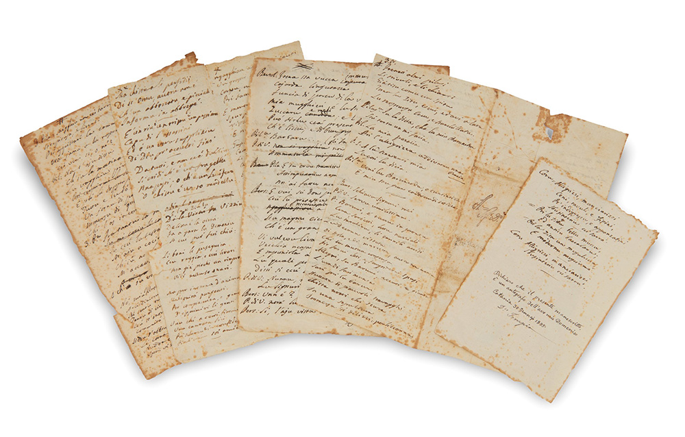 TEMPIO, Domenico (1750-1821). [Catania], XVIII-XIX secolo. Questi appunti rappresentano una pagina preziosa della produzione poetica della città di Catania e di Tempio, il quale, insieme a Giovanni Meli (1740-1815), fu il più grande poeta siciliano della seconda metà del Settecento, conosciuto soprattutto per i suoi versi erotici e licenziosi in dialetto siciliano. Questi appunti mostrano la creazione poetica in fieri, con aggiunte, ripensamenti e cancellazioni di singole parole o intere espressioni. Manoscritti su carta vergellata non filigranata (cc. 5; dimensioni variabili). La mano del testo principale è una sola ed è riconducibile a quella dello stesso Tempio; vi sono aggiunte di poco posteriori (fine XIX secolo) appartenenti al nipote (Domenico Tempio). Fioriture ai margini. Together with Giovanni Meli, Tempio was the greatest Sicilian poet of the mid-18th-century. These manuscripts are representative of his literary production about Catania. A few additions are by Tempio’s nephew Domenico.