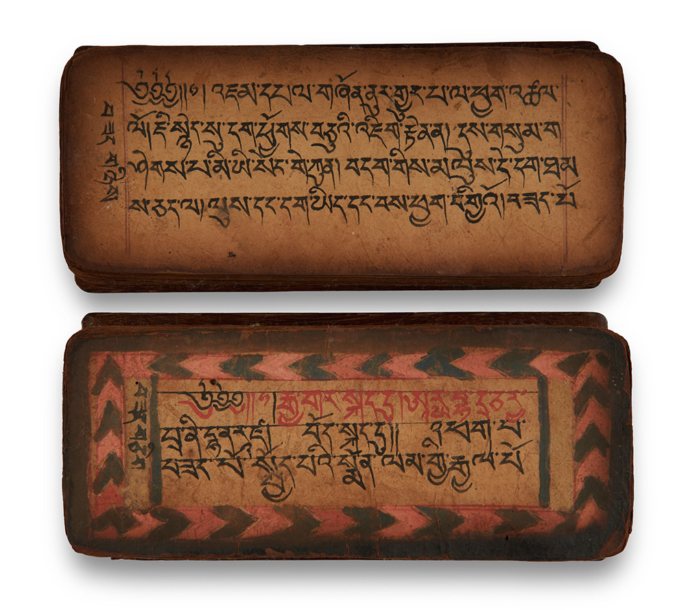 [TIBET] -- Tre manoscritti tibetani di preghiera. Tibet (?), secolo XX. Importanti testimoni delle pratiche di preghiera all'inizio del secolo XX. Alcune carte presentano belle cornici a colori a racchiudere il testo; una miniatura a tempera raffigurante cinque figure divine. Manoscritti su cartoncino color ocra (cc. 76; 920 x 200mm; cc. 41; 85 x 390mm; cc. 54; 95 x 370mm). Scritti su recto e verso in inchiostro nero e rosso, specchio di scrittura incorniciato da duplice filetto in inchiostro rosso o nero spesso sbiadito o in matita. Legature con piatti in legno intagliato, ad eccezione di uno che è privo di legatura. Gore di umidità, fioriture diffuse e tracce di tarlo. Three Tibetan manuscripts. A testimony of the religious practices in Tibet at the beginning of the 20th-century.