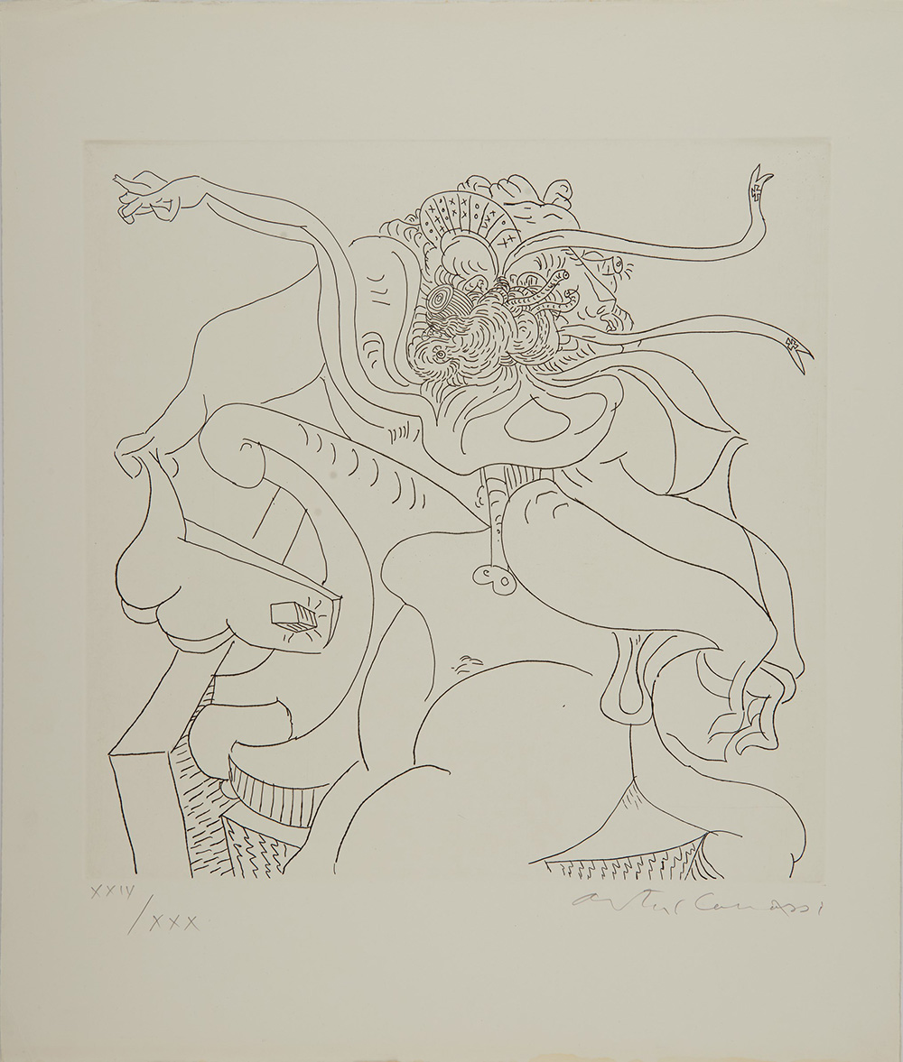 CARRIERI, Raffaele (1905-1994) -- Arturo CARMASSI (1925-2015). Due poesie. Toninelli Arte Moderna-Livorno e Graphis Arte Milano, 1974. L'opera comprende due poesie di Raffaele Carrieri, tre acqueforti fuori testo firmate e numerate, due nel testo e dieci fotolitografate di Arturo Carmassi. Il disegno della copertina è originale ed eseguito a mano dall'artista. L'esemplare riporta una dedica autografa di Carmassi "All'amico Arnold Koheler con gli auguri di un solare 1978". Formato atlantico (640 x 540mm). Legatura editoriale racchiusa nel cofanetto originale in ottime condizioni. Esemplare XXIV/105. With two poems by Raffaele Carrieri, 3 signed and numbered etchings, 2 illustrations and 10 photolithographic plates by Arturo Carmassi. The drawing on the front cover is also by the artist and the book is annotated to his friend Arnold Koheler with the best wishes from the artist in 1978. Number XXIV of a limited edition of 105.