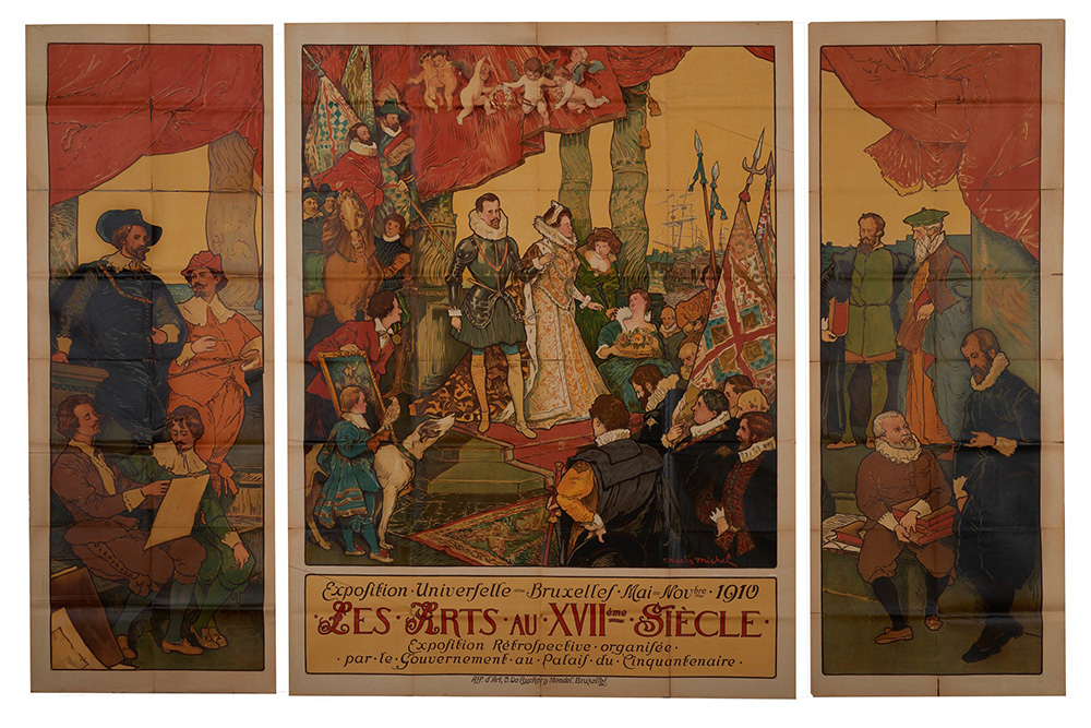 [MANIFESTO] -- Exposition Retrospective organizée par el Gouvernement au Palais du Cunquantenaire Aff. d’Art V. de Rycker & Mendel. Bruxelles: 1910. Raro esemplare di questo manifesto pubblicitario pubblicato in occasione della retrospettiva Belga del 1910. 3 pezzi. Manifesto centrale (160 x 120cm), manifesti destro e sinistro (160 x 60cm ciascuno); intera composizione (160 x 240cm). (Alcuni difetti, rotture e mancanze). Rare example of this poster published for the Belgian retrospective of 1910.