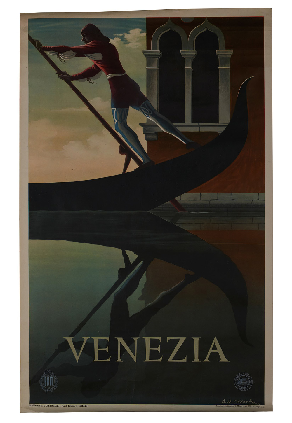 [MANIFESTO] -- CASSANDRE, Adolphe Mouron (1901-1968). Venezia. 1951. Raro manifesto in ottime condizioni. Cassandre illustra una tranquilla veduta sul canale veneziano in uno stile che riprende le sue composizioni teatrali. Calcografia & Cartevalori. (100 x 63cm). In very good condition.