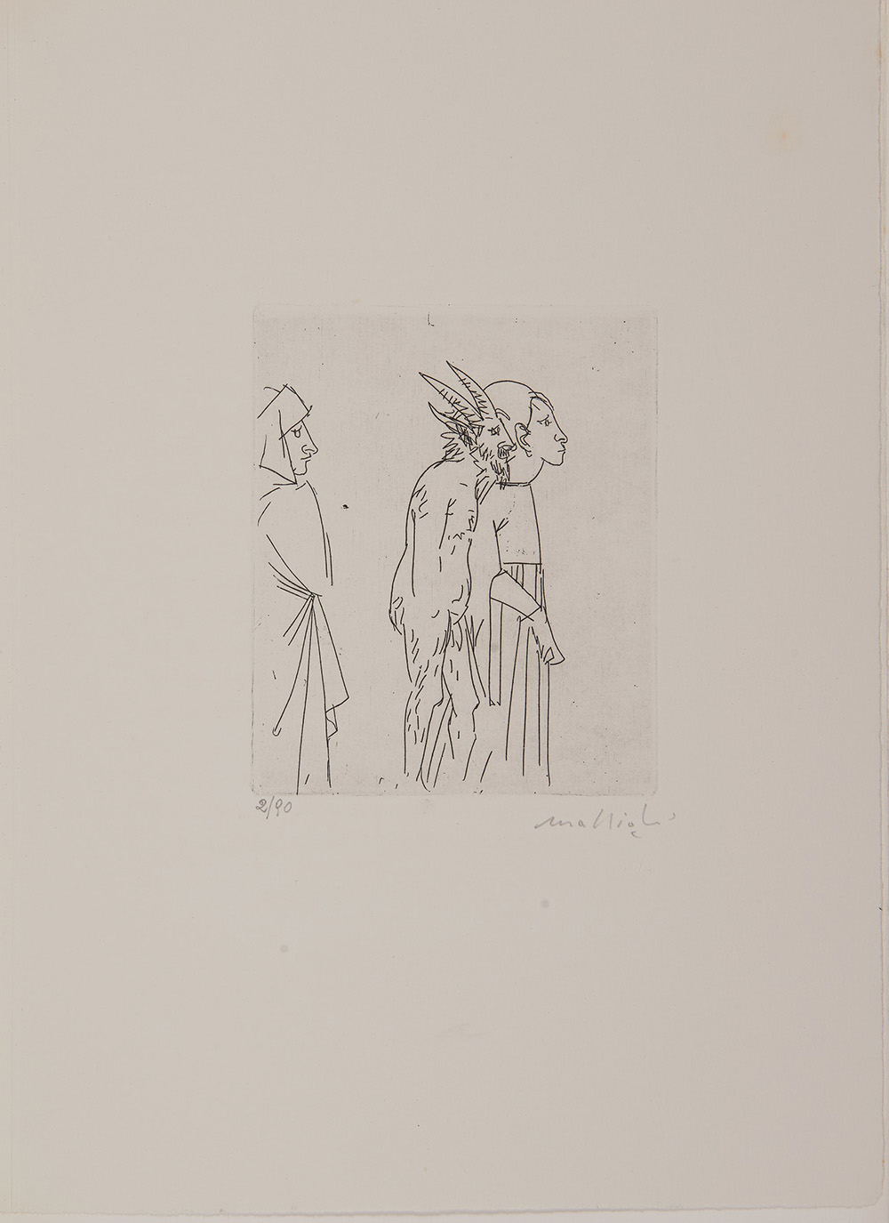 MATTIOLI, Carlo (1911-1994) -- Niccolò MACHIAVELLI (1469-1527). Belfagor, novella piacevolissima di Niccolò Machiavelli. Milano: Cerastico Editore, 1967. Bell'esemplare illustrato da 8 acqueforti appositamente ideate da Carlo Mattioli, numerate e firmate a matita dall'artista. E' inoltre allegato un disegno acquarellato firmato dall'artista. 4to (315 x 230mm). 8 acqueforti. Legatura editoriale in cartonato di colore rosso in ottime condizioni. Esemplare 2/100 (I serie da 1 a 10). Entro cofanetto. A fine copy with 8 etchings by Carlo Mattioli numbered and signed by the artist in pencil. Copy n. 2 of a limited edition of 100.