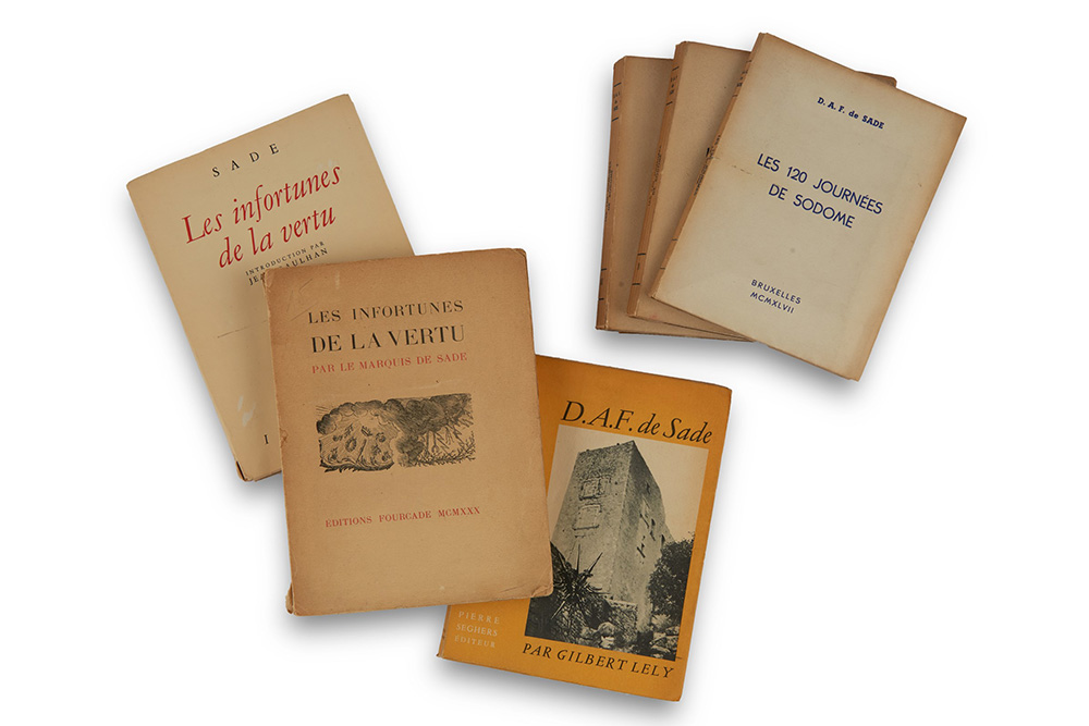 [SURREALISMO] -- Gruppo di libri di DE SADE (1740-1814) che comprende Les 120 Journées de Sodome. Bruxelles: 1947-48. 3 volumi, piccolo 4to (167 x 125mm). -- Les Infortunes de la Vertu. Parigi: Foucarde, 1930. Copia n. 1995 di un’edizione di 3065. 4to (205 x 150mm). -- Les Infortunes de la vertu. Edition du point du jour, 1946. Copia n. 1517 di un’edizione di 2040. 4to (190 x 142mm). -- Gilbert LELY (1904-1985). D.A.F. de Sade. Parigi: Pierre Seghers, 1948. Tutti conservati in brossura originale (lievi difetti). A group of books by De Sade. All in their original bindings (some minor defects).