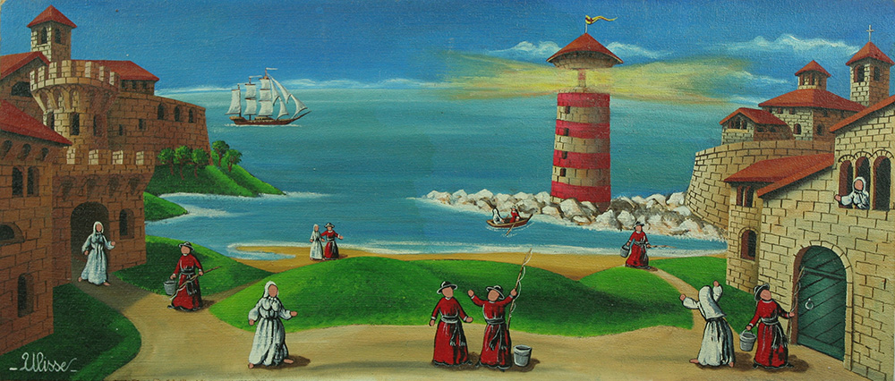 ULISSE Osimo 1957 " Il faro " olio su tavola 30 x 70 cm firmato in basso a sinistra; al retro timbro e archivio