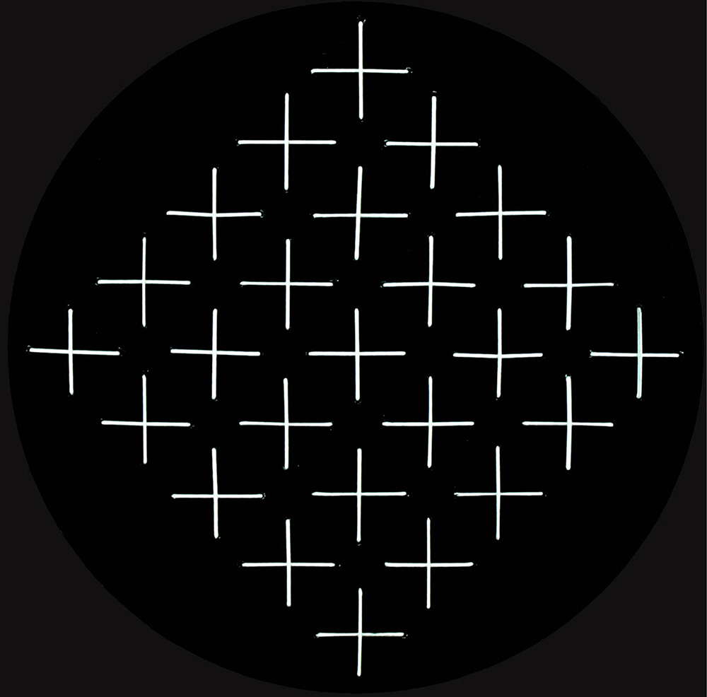 EDOARDO LANDI San Felice sul Panaro 1937 " Struttura visuale " anno 1971 filo elastico bianco su fondo acrilico nero Ø 30 su base 40 x 40 cm firmato, datato e titolato al retro Autentica rilasciata dal Maestro