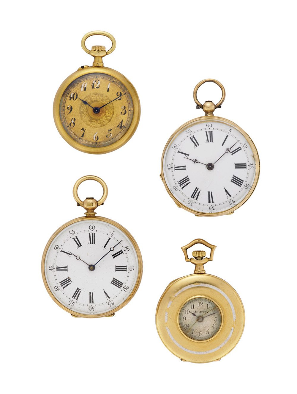Lotto composto da quattro orologi da tasca da donna in oro 18K e smalto, due...