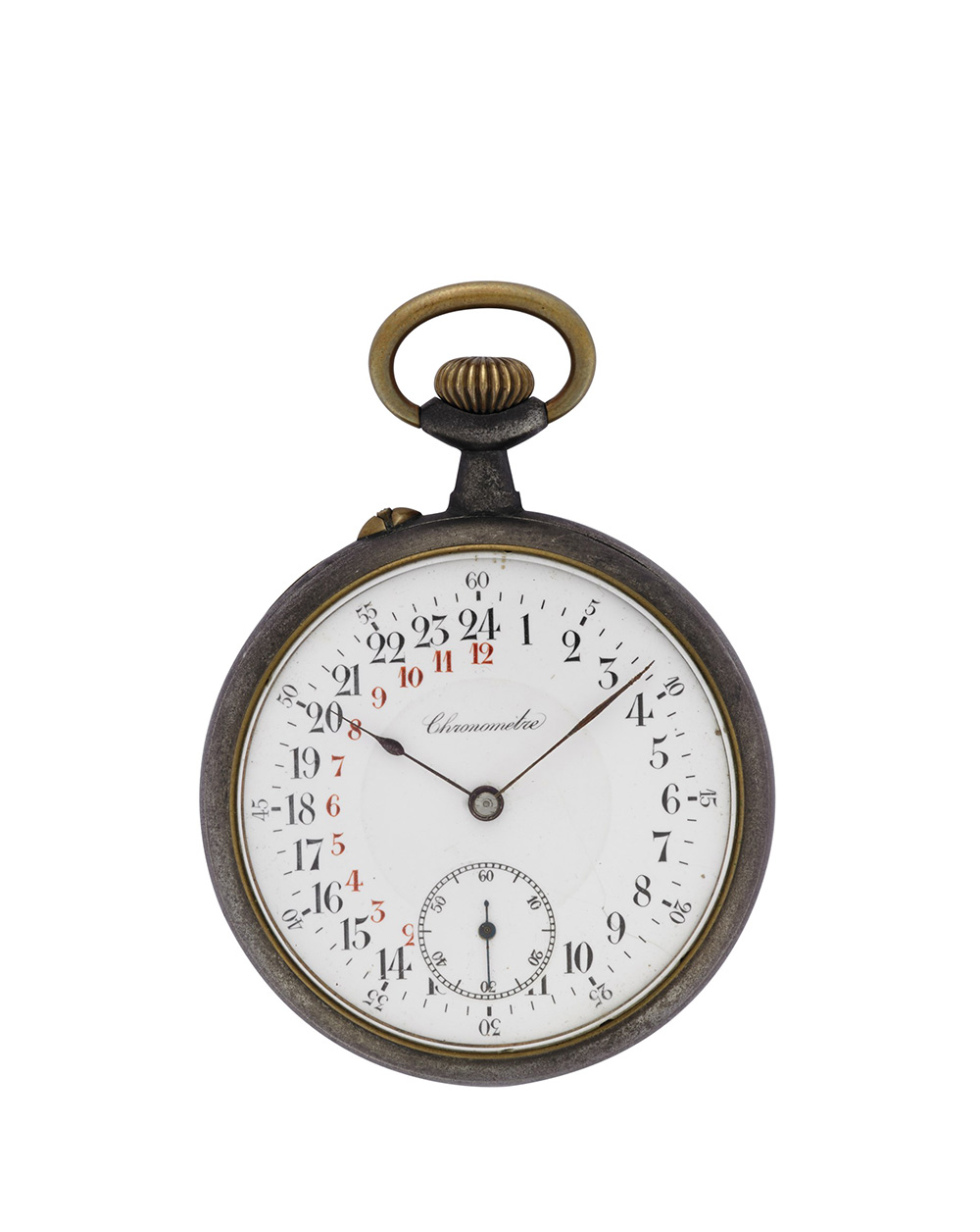 ANONIMO Orologio da tasca da uomo in ferro Epoca inizio sec. XIX Movimento con carica remontoir Quadrante in smalto bianco con cifre arabe e suddivisione delle ore in 24 Cassa n. 418317474 Diam. mm 49 ANONYMOUS Gent's iron pocket watch Early 19th century Manual wind movement White enamel dial with Arabic numerals Diam. mm 49
