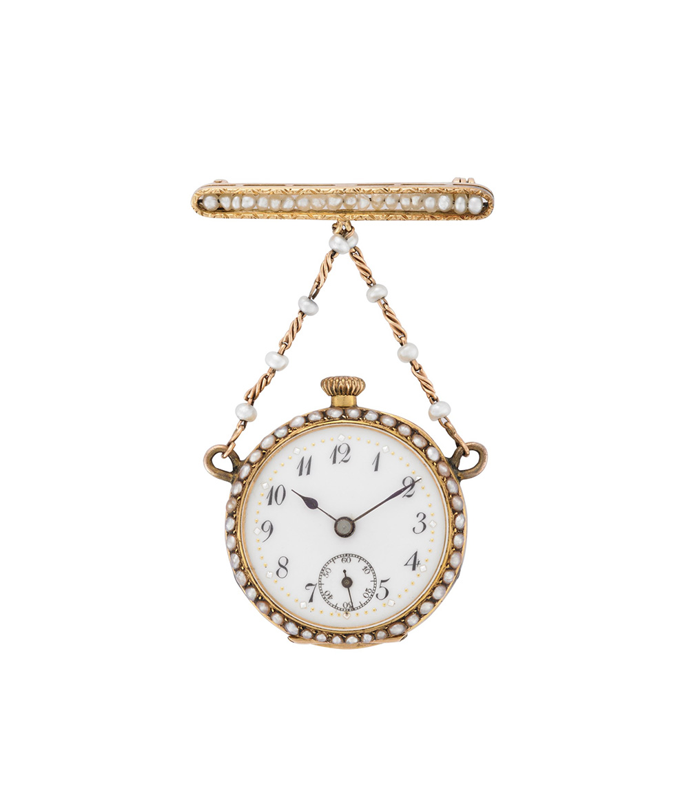 ANONIMO, SVIZZERA Orologio da donna a spilla in oro 14K, smalto verde e perle...