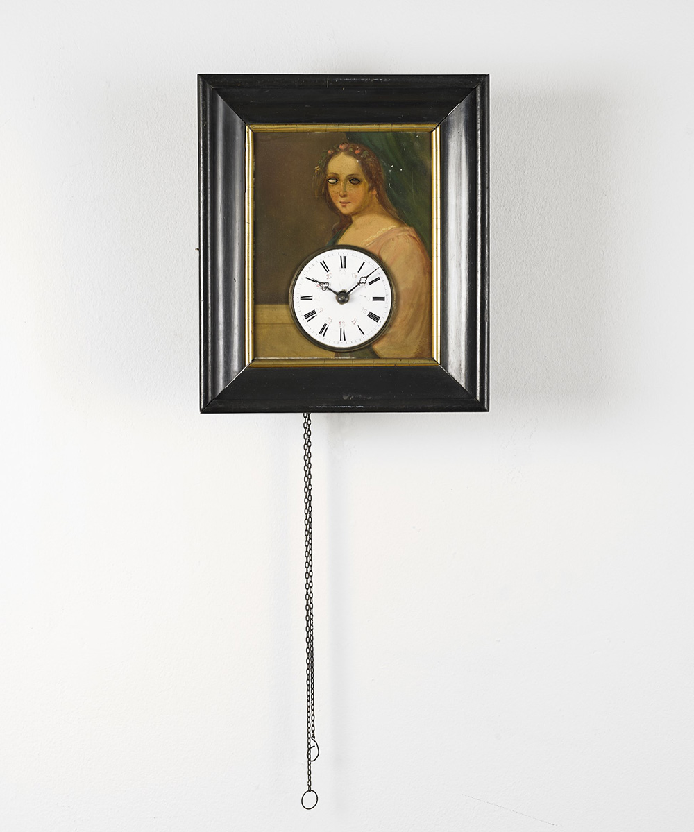 ANONIMO, FORESTA NERA Orologio con figura dipinta e meccanismo di apertura e chiusura degli occhi della dama ritratta Epoca inizio sec. XIX Movimento a carica giornaliera, suoneria su gong Quadrante in smalto bianco con cifre romane Misure h cm 32 (difetti, mancanze) ANONYMOUS, BLACK FOREST Clock with painted lady which opens and closes her eyes Early 19th century Daily wind movement striking on gong White enamel dial with Roman numerals h cm 32 (defects and losses)