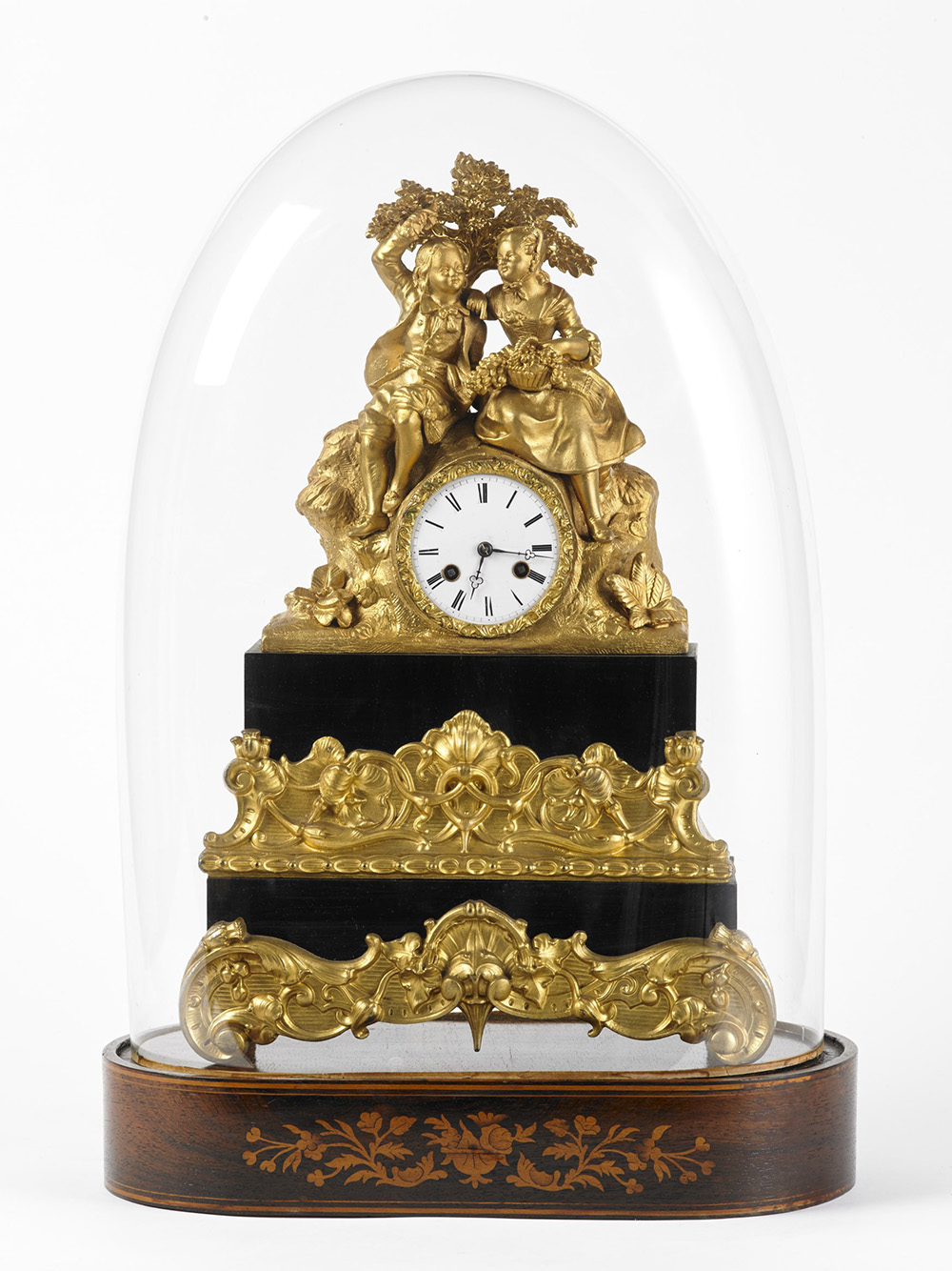 ANONIMO, FRANCIA Pendola da camino in antimonio dorato a vernice con scena galante Epoca metà sec. XIX Movimento con carica settimanale a chiavetta, suoneria delle ore e delle mezze su campanello, scappamento ad ancora, sospensione a filo Quadrante in smalto bianco con cifre romane Misura h cm 45 ANONYMOUS, FRANCE Gilt antimony and varnish mantle clock Mid 19th century Eight-day key wind movement, hour and half-hour striking on bell, ancor escapement White enamel dial with Roman numerals h cm 45