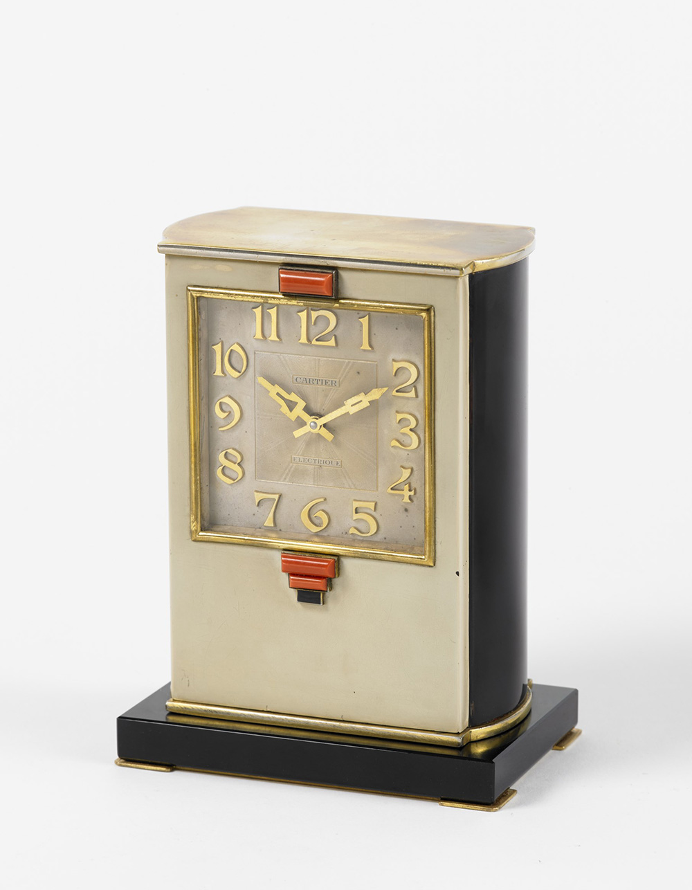 CARTIER Orologio da scrivania in ottone, corallo, lacca e onice Anni '30/'40...