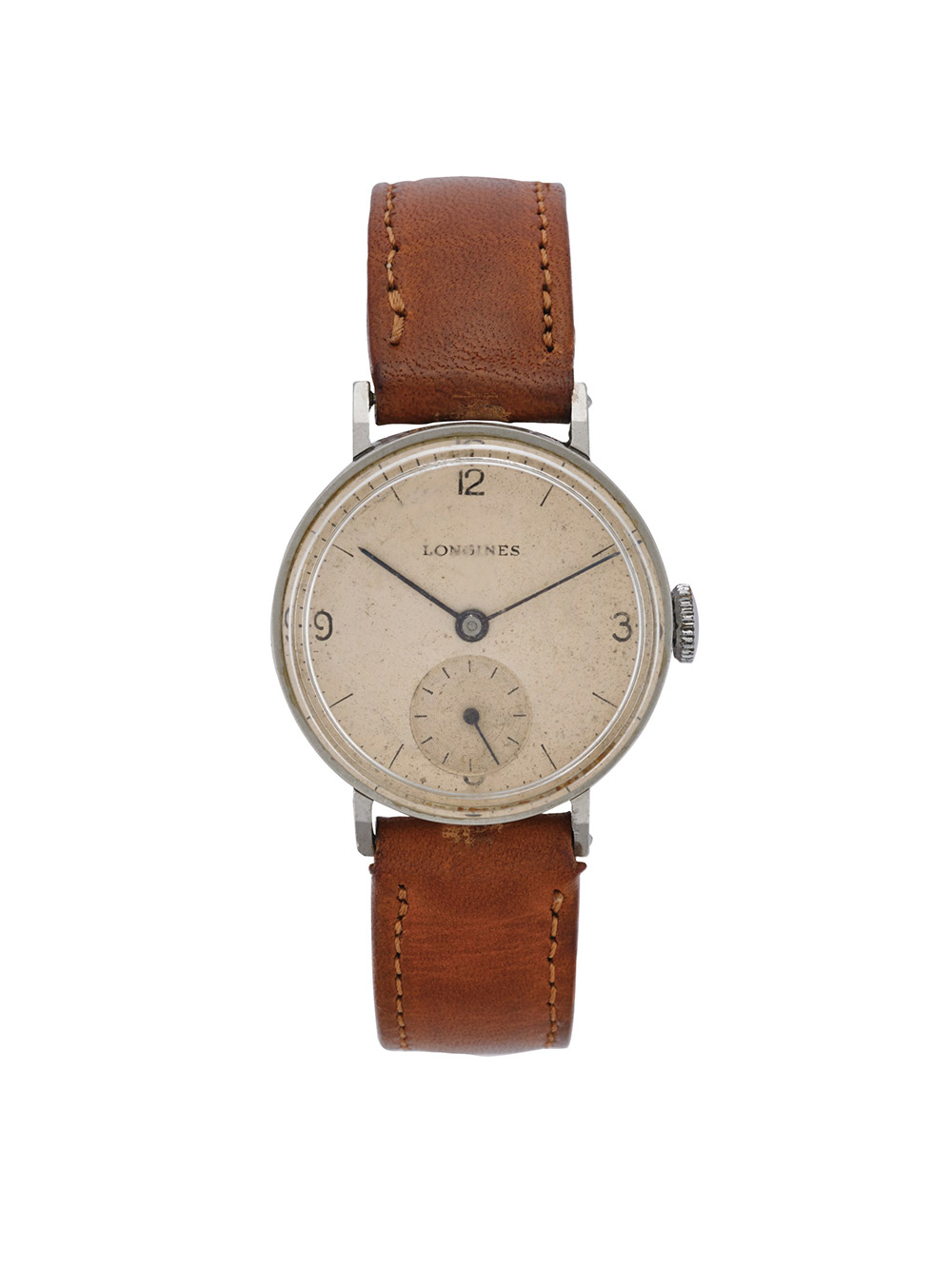 LONGINES Orologio da polso in acciaio Anni '40 Quadrante, movimento e cassa firmati Movimento con carica manuale Quadrante argentato con indici e cifre arabe, quadrantino ausiliario per i secondi alle ore sei Cassa n. 5619993 Diam. mm 31 LONGINES Gent's steel wristwatch 1940s Dial, movement and case signed Manual wind movement Silvered dial, Arabic numerals and indexes, auxiliary dial Diam. mm 31