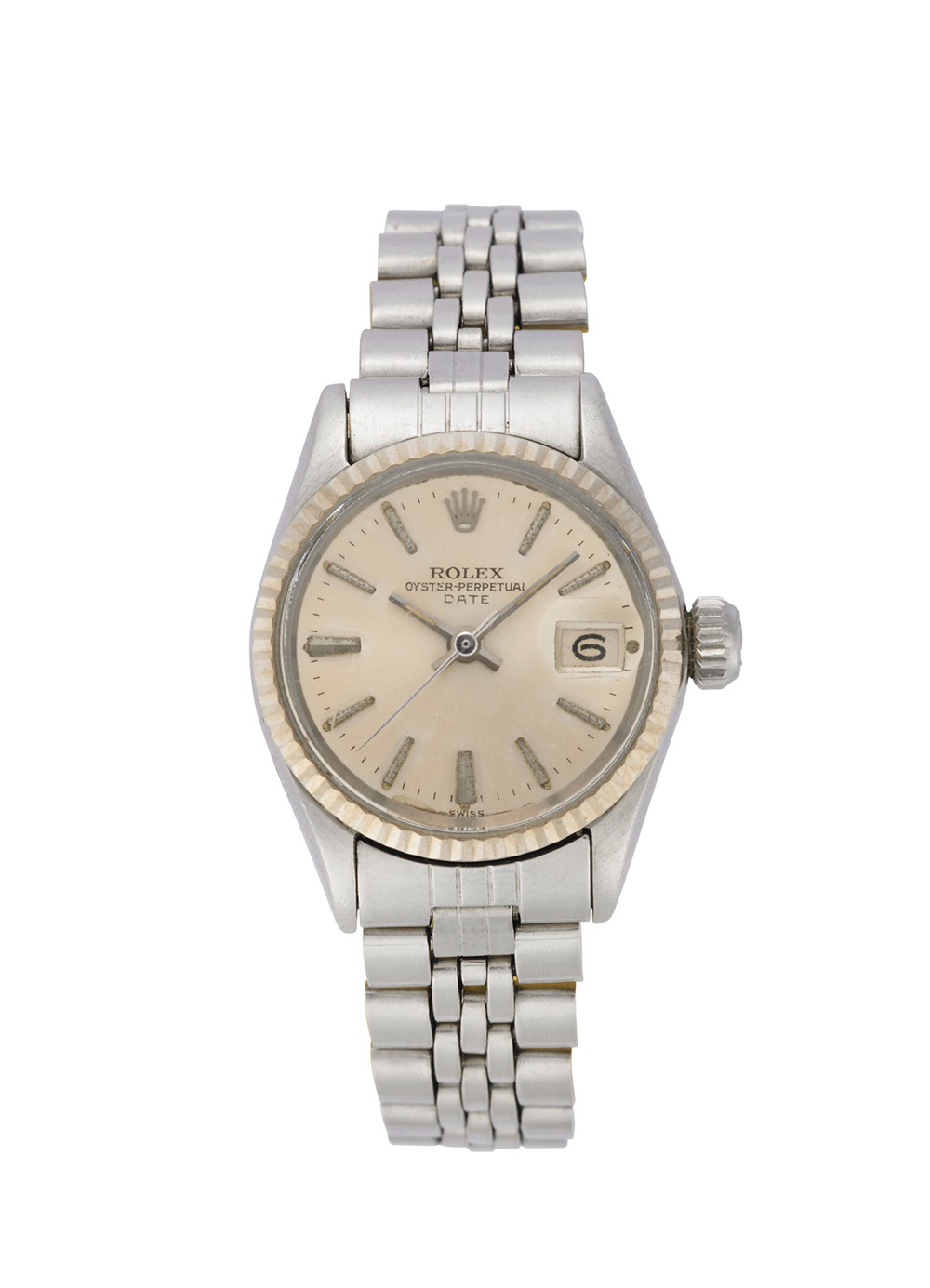 ROLEX Orologio da polso da donna in acciaio Anni ' 70 Quadrante, movimento e cassa firmati Movimento con carica automatica Quadrante argentato con indici riportati, secondi al centro, data Ref. 6517 Cassa n. 779879 Diam. mm 24 ROLEX Lady's steel wristwatch 1970's Dial, movement and case signed Automatic wind movement Silvered dial, applied indexes Diam. mm 24