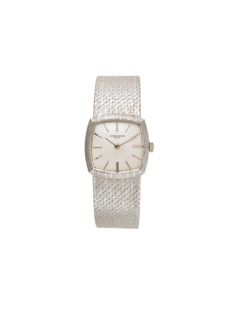 VACHERON CONSTANTIN Orologio da polso da donna in oro 18K con bracciale integrato Anni '60 Quadrante, movimento e cassa firmati Movimento con carica manuale Quadrante argentato con indici riportati Cassa n. 470022 Misure mm 20x20 VACHERON CONSTANTIN Lady's 18K gold wristwatch and bracelet 1960s circa Dial, movement and case signed Manual wind movement Silvered dial, applied indexes mm 20x20