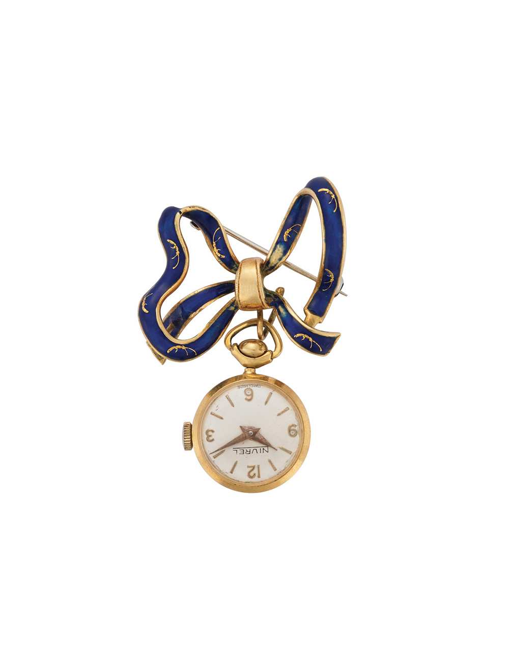 NIVREL Orologio da donna a spilla in oro 18K e smalti Anni '50/'60 Quadrante...