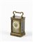 ANONIMO Officier in ottone con vetri molati Epoca fine sec. XIX, inizio sec. XX Movimento con carica settimanale, sveglia Quadrante in ottone dorato e smalto con numeri arabi, quadrantino ausiliario alle ore sei per puntamento sveglia Misura h cm 15 circa (con maniglia aperta) Con astuccio ANONYMOUS Brass and bevelled glass travel clock Late 19th, early 20th century Movement with eight day power reserve, alarm Dial with Arabic numerals and auxiliary dial h cm 15 circa (with open handle) With box