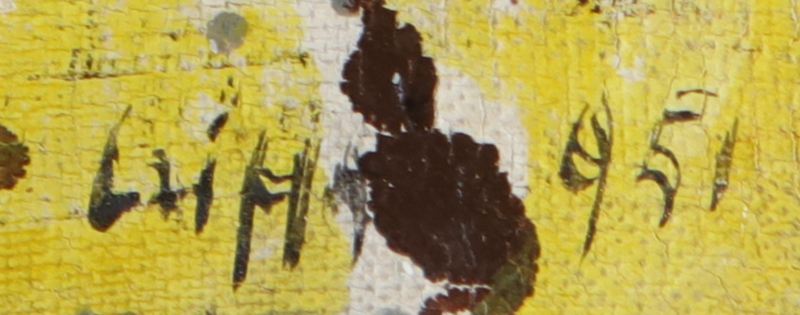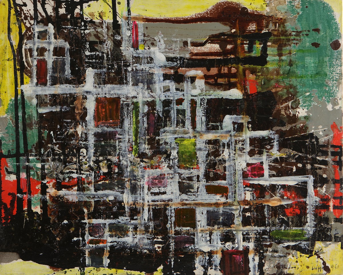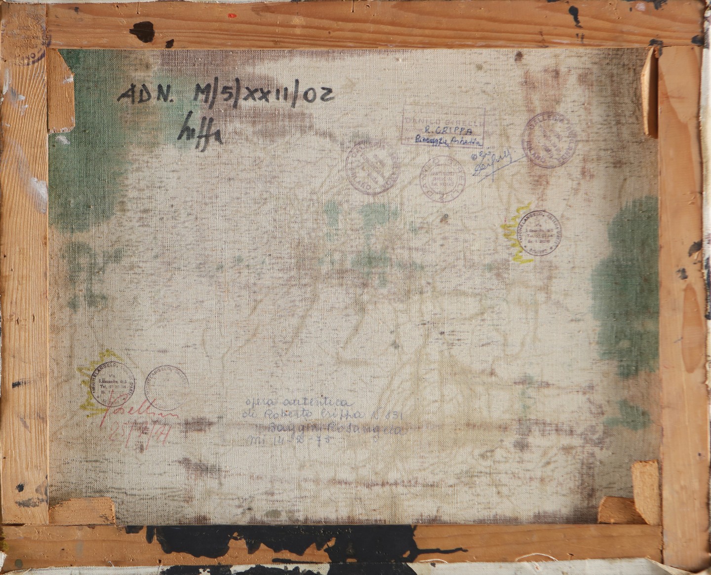 CRIPPA ROBERTO GAETANO (1921 - 1972) Geometric. 1951. Oil on canvas . Cm 51,00 x 40,00. Signature and year lower right. Danilo Girelli, Brescia, and Michelangelo Gallery, Bergamo, stamps at the back. ROberto Crippa Jr authenticity certificate on photo.. Cornice presente