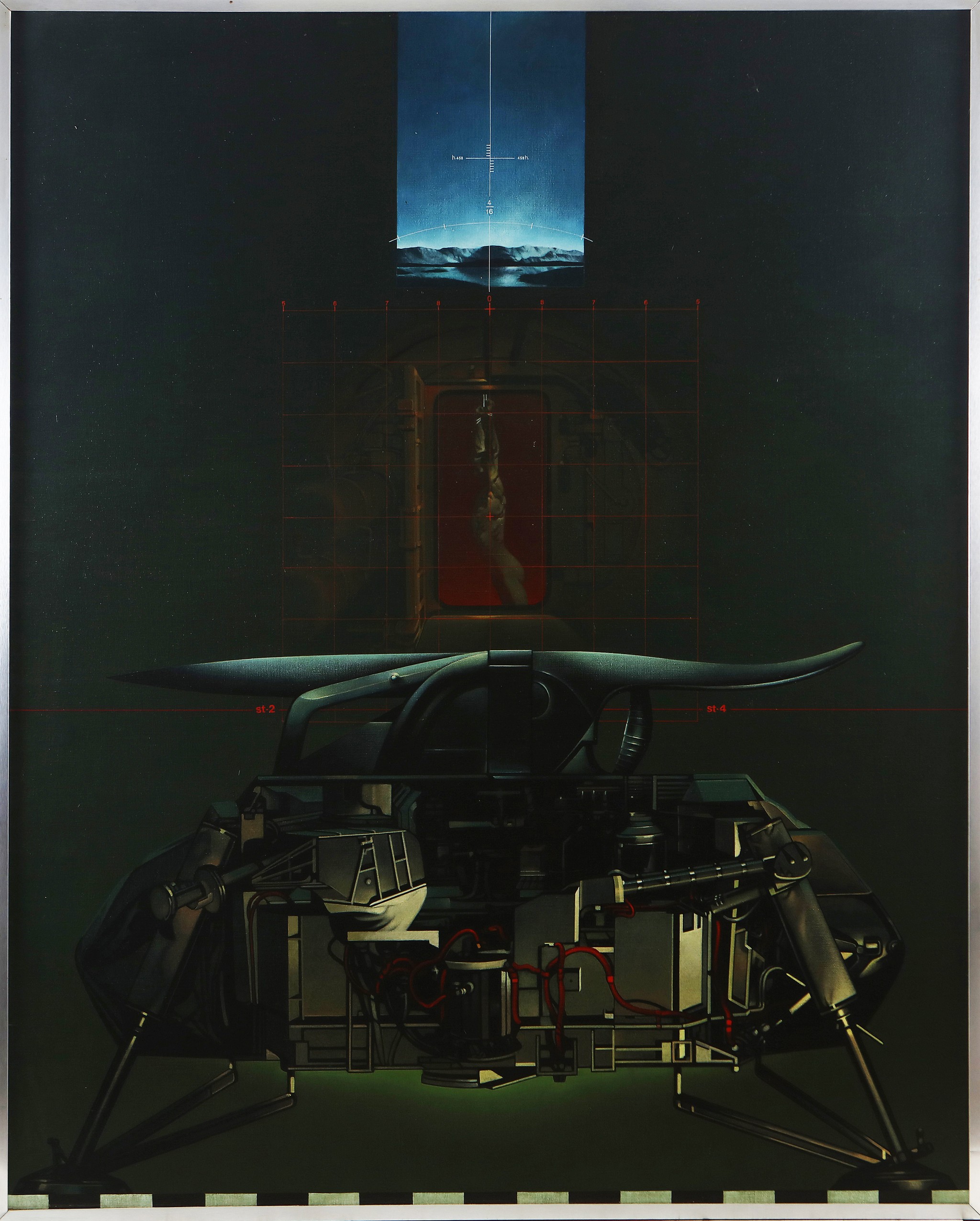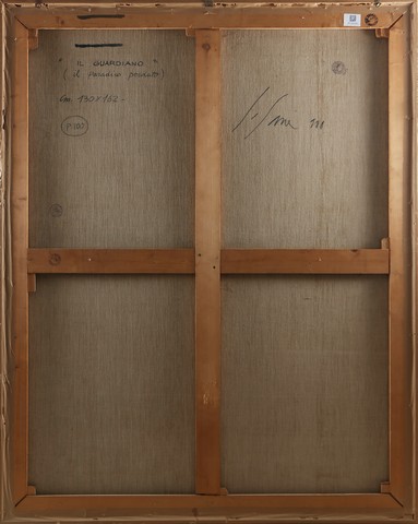 SARRI SERGIO (n. 1938) The Guardian (Paradise Lost). 1980. Oil on canvas . Cm 130,00 x 162,00. Title, signature, year and Galleria San Michele, Brescia stamp at the back. Cornice presente