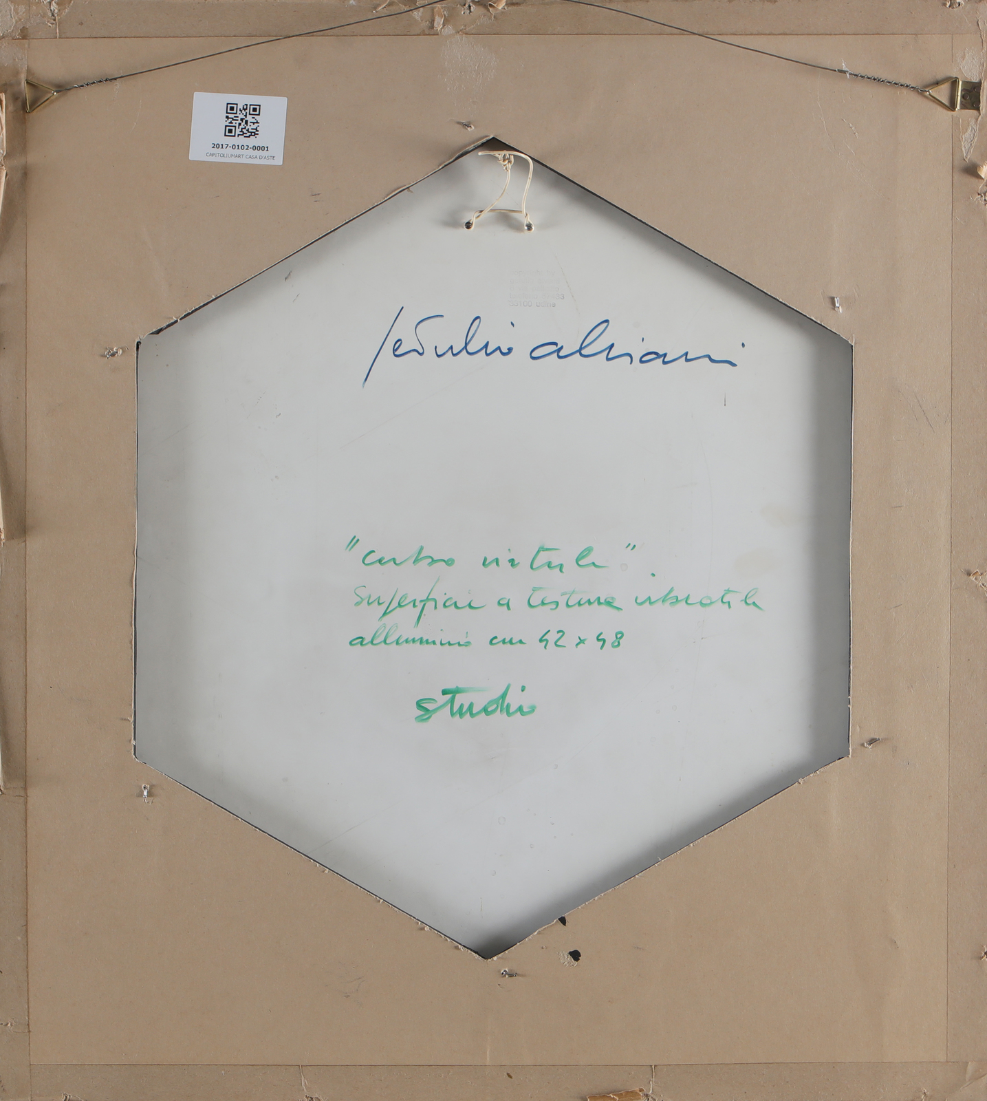 ALVIANI GETULIO (n. 1939) Virtual Center. Aluminium. Cm 48,00 x 42,00. Title and signature at the back. Provenance: Gillo Dorfles collection (written certificate on photo by Giorgetta Dorfles). Cornice presente
