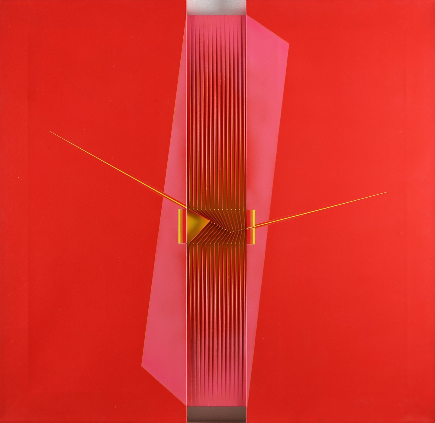 BIASI ALBERTO (n. 1937) Attraverso un piano inclinato. . 2000. Acrilico su tela. Cm 100,00 x 104,00. Al retro firma, titolo e anno. Autentica dell'artista su fotografia. Provenienza: Paci Arte, Brescia (cartiglio al retro, certificato di provenienza); Collezione Privata, Napoli.