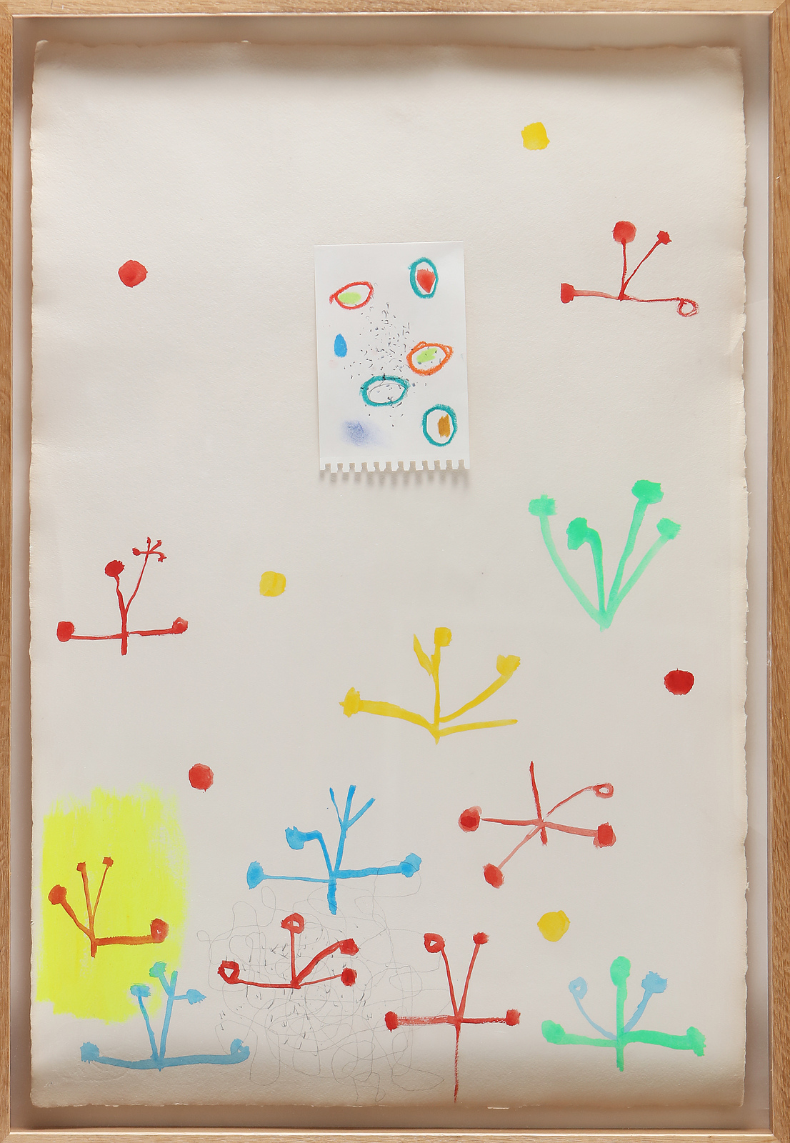 DE MARIA NICOLA (n. 1954) Evoluzioni dello spirito. Tecnica mista e collage su carta. Cm 50,00 x 75,50. 1999 - 2000. Al retro cartiglio descrittivo a cura della Galerie Lelong, Parigi. Certificato di autenticità a cura della Galerie Lelong, Parigi. Pubblicazione: Nicola De Maria - La purezza: musica proibita a cura della Galerie Lelong, Parigi. . Cornice presente