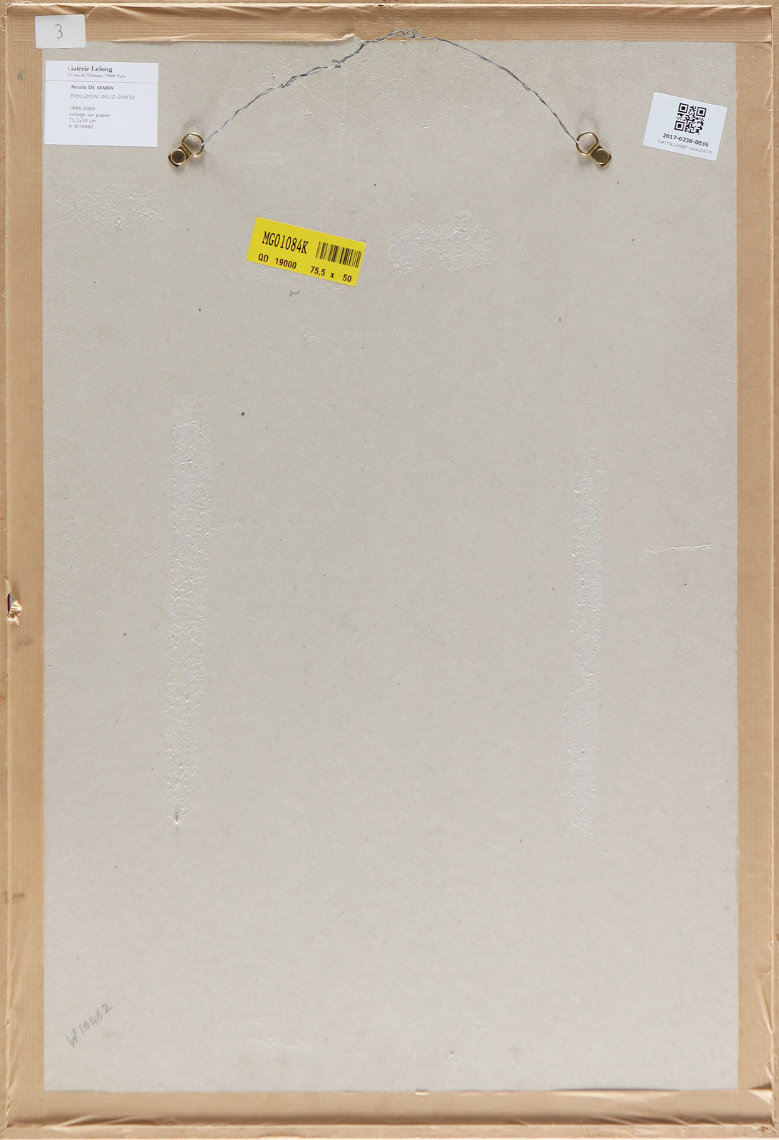 DE MARIA NICOLA (n. 1954) Evolutions of the spirit. Mixed media and collage on paper. Cm 50,00 x 75,50. 1999-2000. At the rear descriptive cartouche by the Galerie Lelong, Paris. Certificate of authenticity by the Galerie Lelong, Paris. Publication: Nicola De Maria - Purity: music banned by the Galerie Lelong, Paris. . Cornice presente