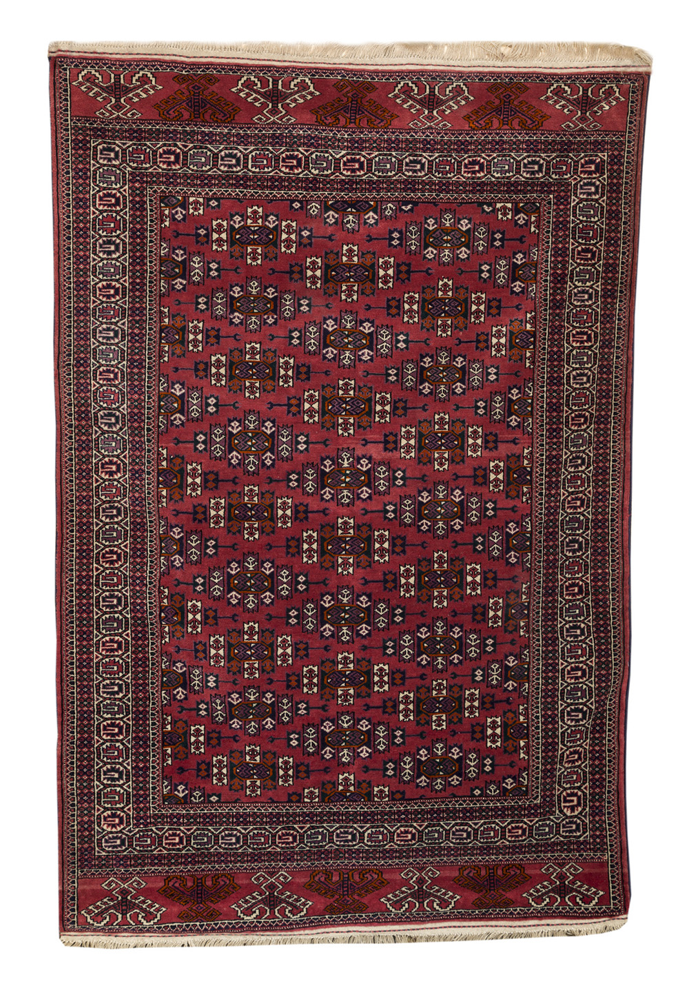 Tappeto a fondo rosso, decorato a motivi geometrici nei toni del bianco e del...