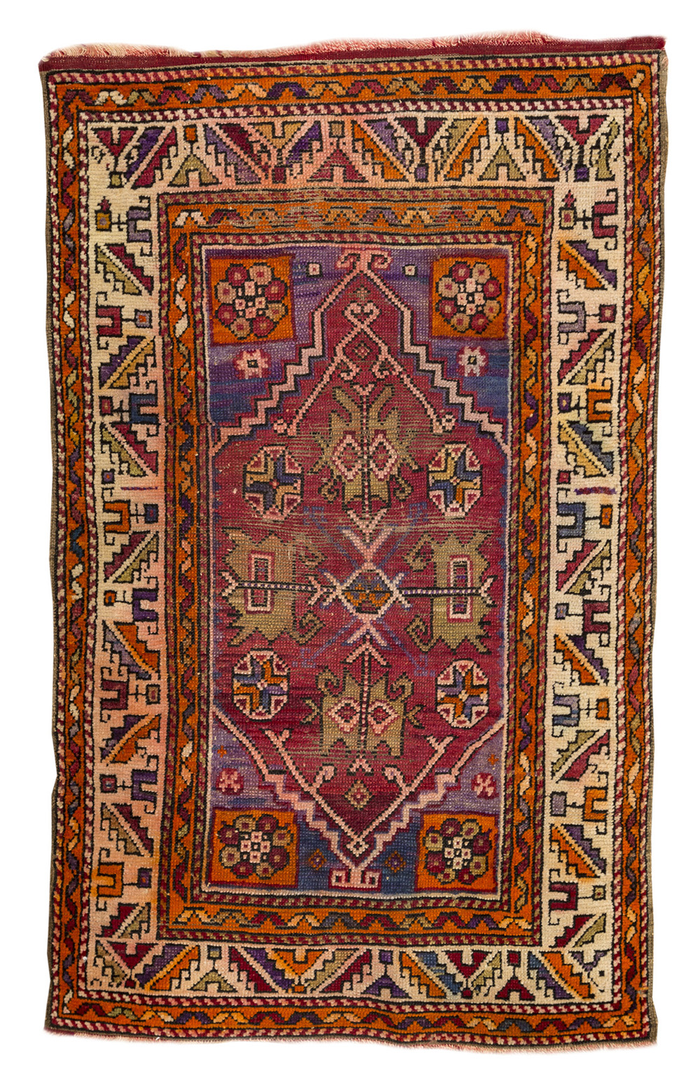 Tappeto fondo arancio, decorato a motivi geometrici nei toni del rosso, bianco e celeste cm 137x83