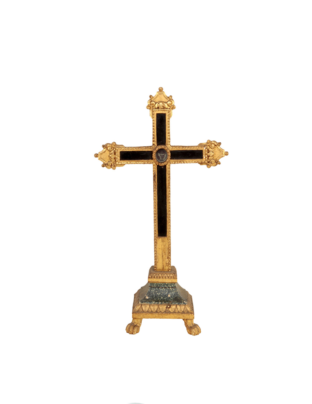 Croce reliquiario in legno dorato, poggiante su piedistallo squadrato sorretto da piedi ferini, cm 52 x 30