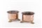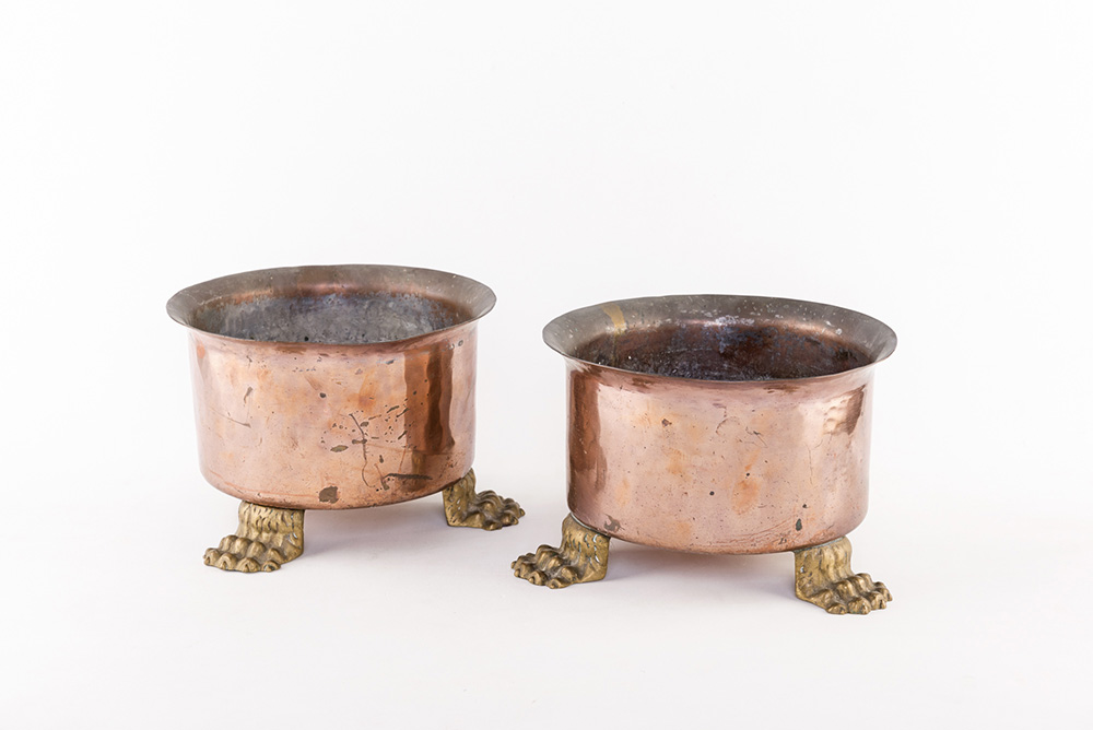 Coppia di cachepots in rame di forma circolare con bordo svasato, sorretti da piedi ferini in bronzo. Cm 14x21
