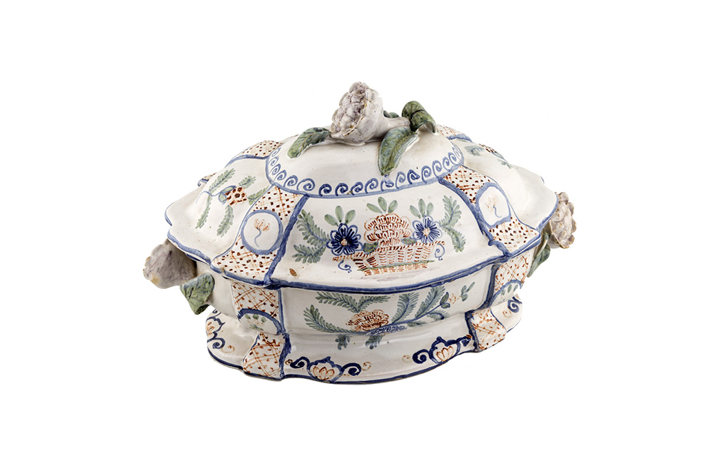 Zuppiera in maiolica policroma con decora floreale XIX secolo, cm 24x40x26