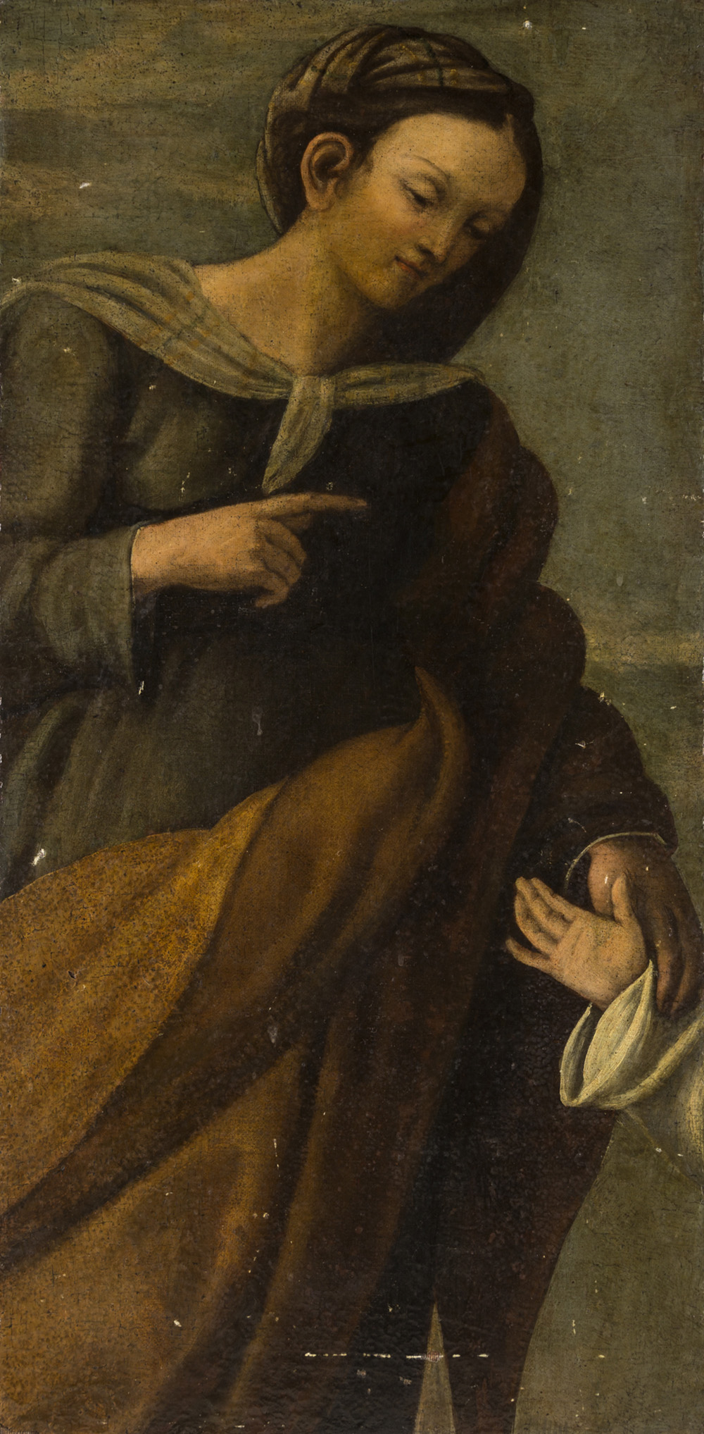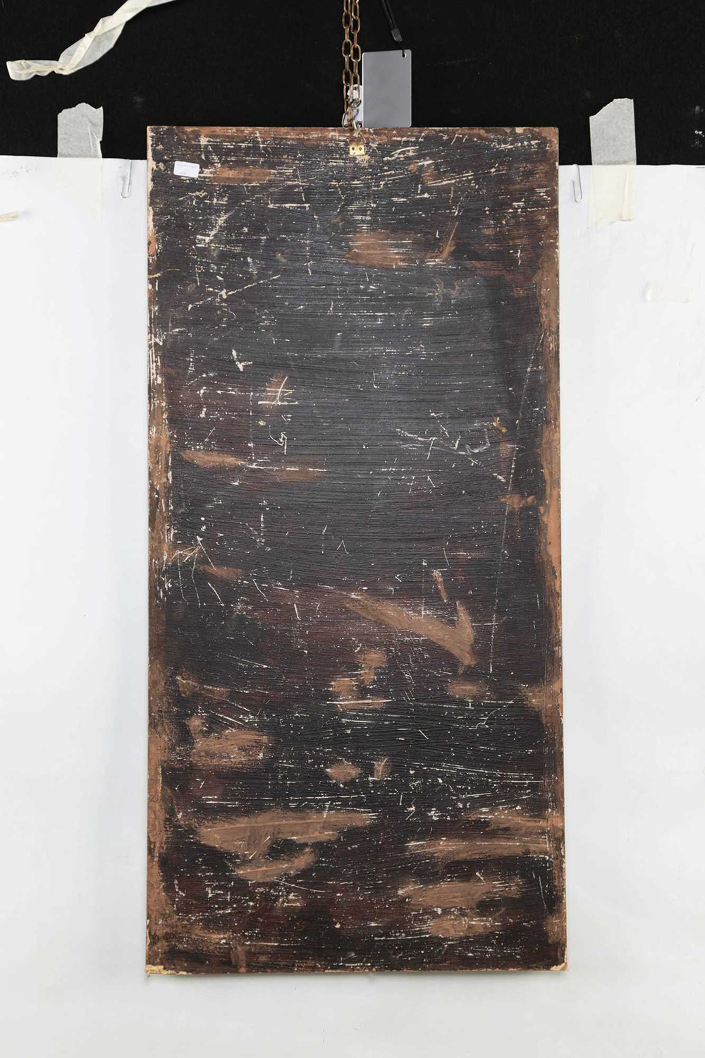 Madonna, frammento di pittura ad olio su tela applicato su tavola, cm 93x46