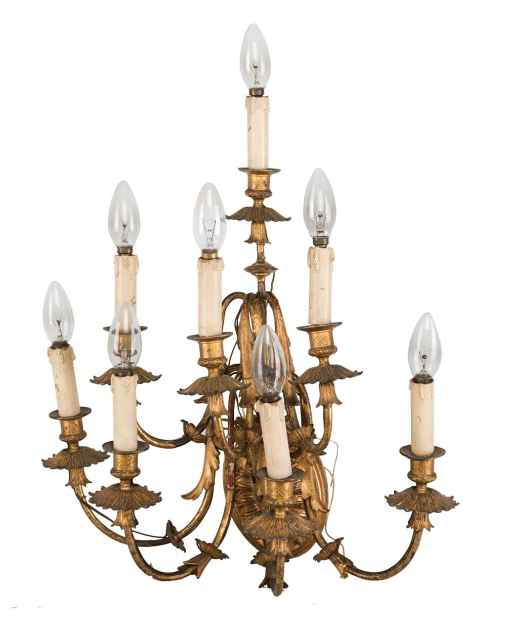 Coppia di appliques in stile neoclassico, a otto luci in metallo dorato con applicazioni in legno intagliato e dorato fine del XIX secolo, h. cm 48
