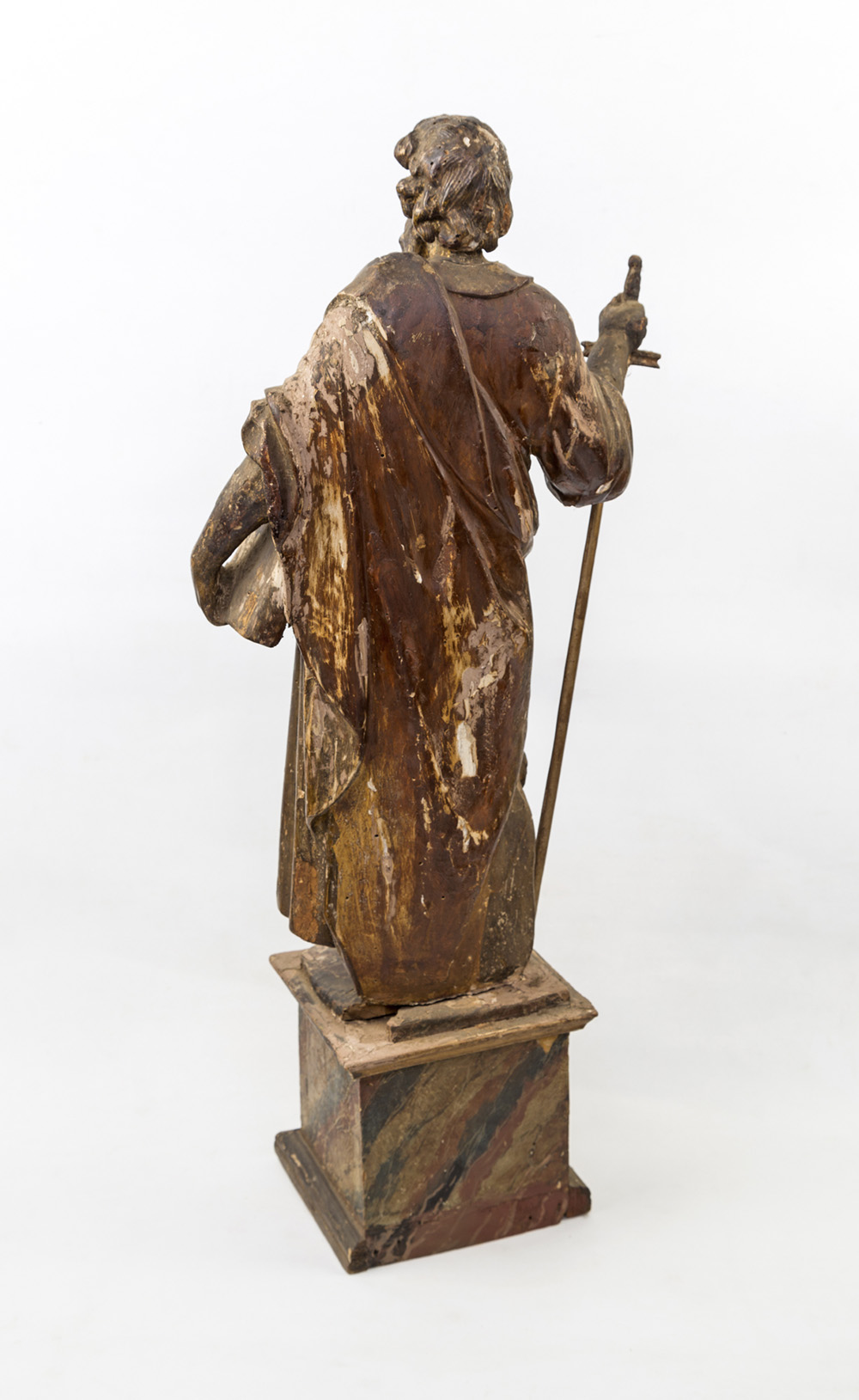 Scultura in legno raffigurante San Paolo di Tarso, ritratto con il libro dei codici e la spada, stante su piedistallo dipinto ad imitazione del marmo centrato da vano porta reliquie. XVII secolo, cm 74 x 16,5 x 18