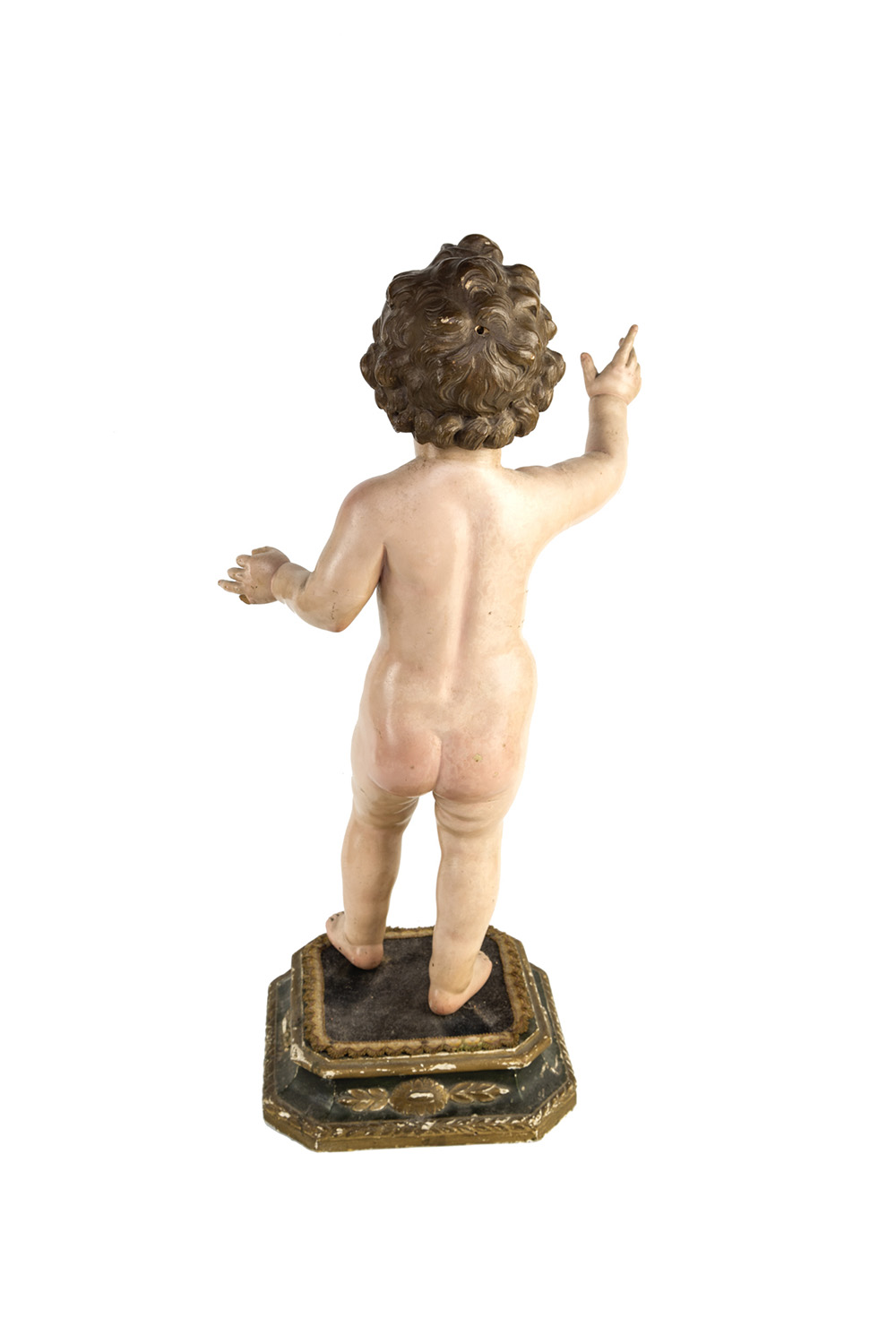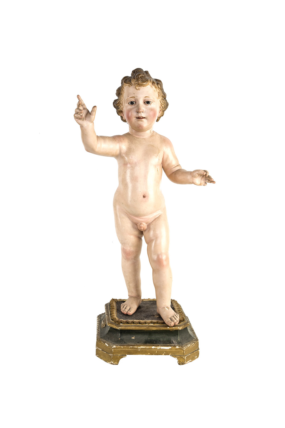 Scultura in legno laccato raffigurante Bambino Gesù benedicente, stante su basso piedistallo squadrato con piedi a mensola. XVIII secolo, cm 60 x 35 Restauri alla lacca.