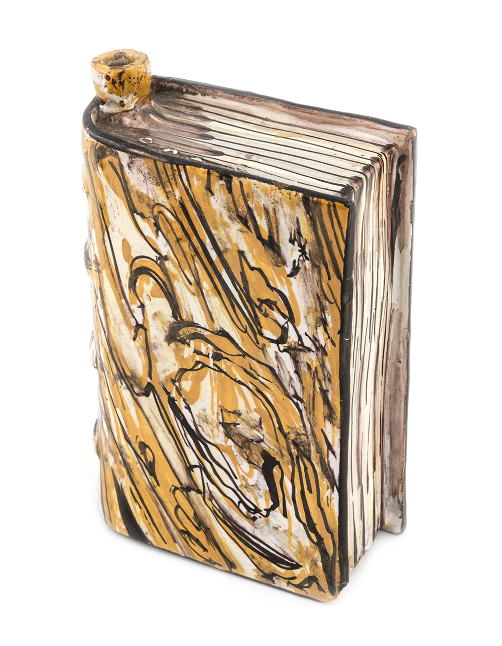 Fiasca in maiolica scaldamani a forma di libro, manifattura Campana del XVIII secolo, cm 19x11x5,5