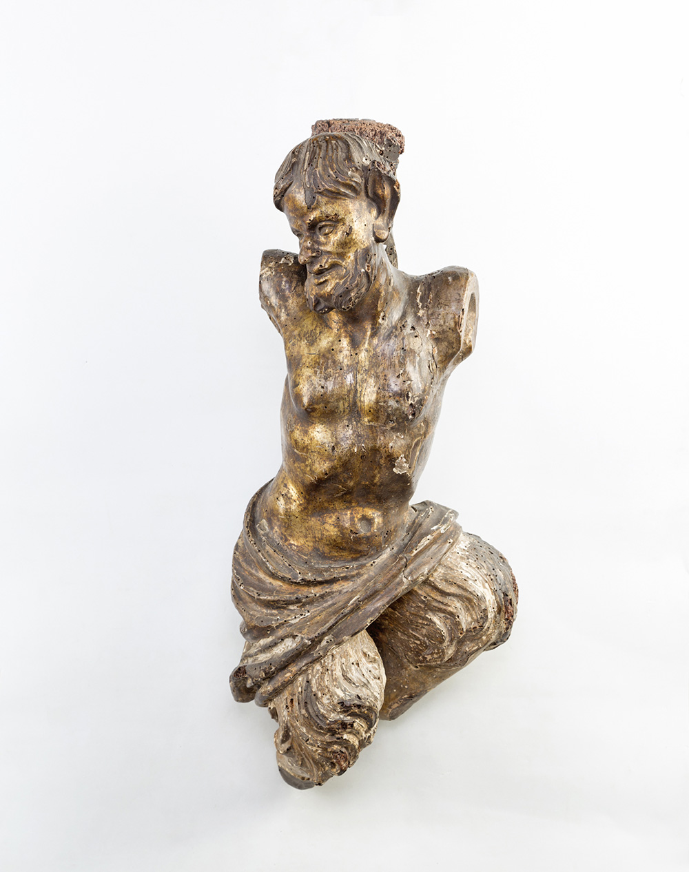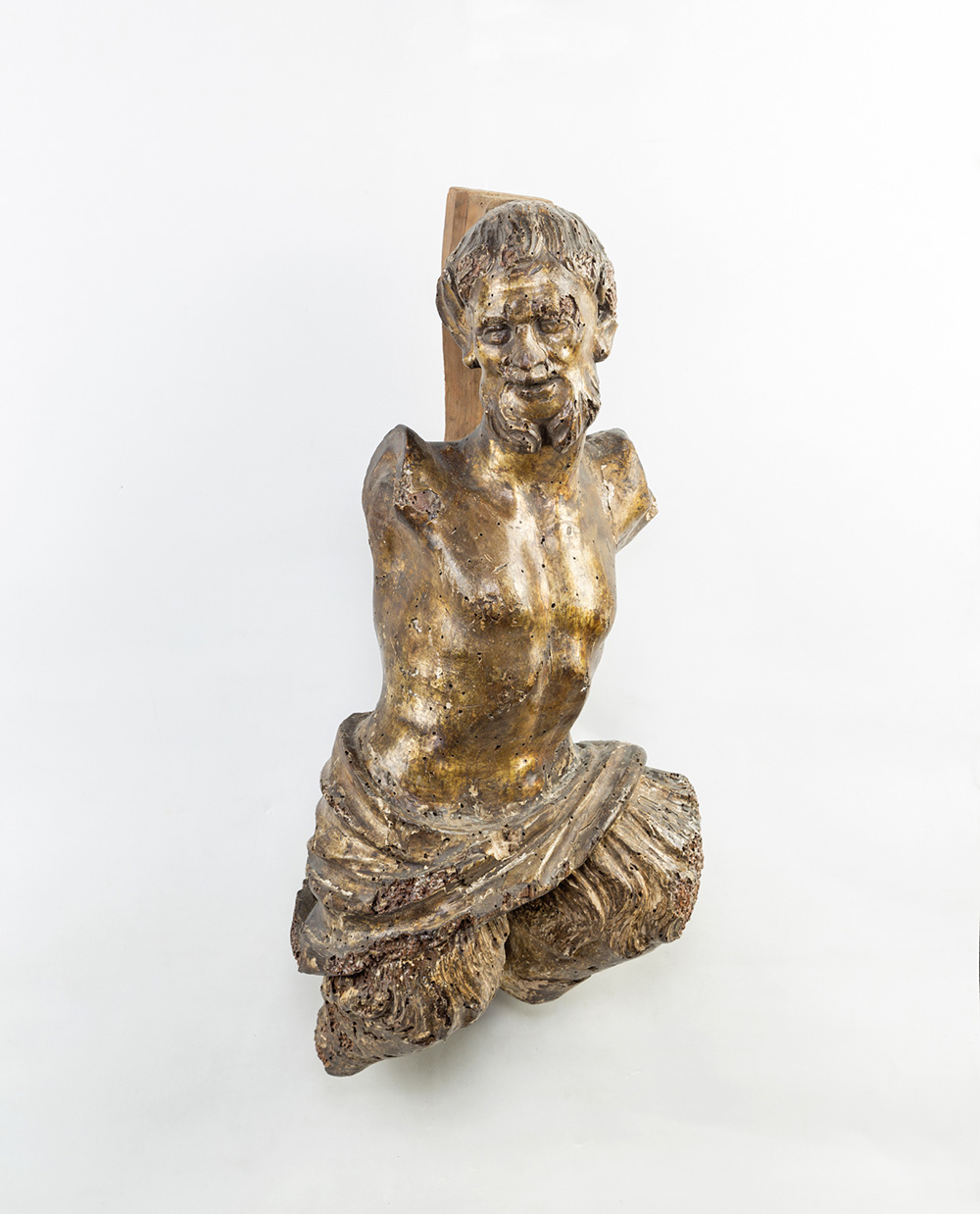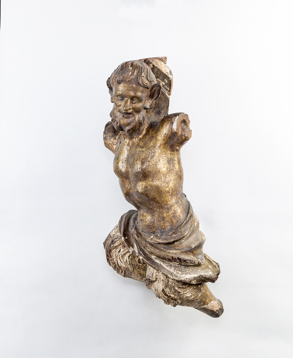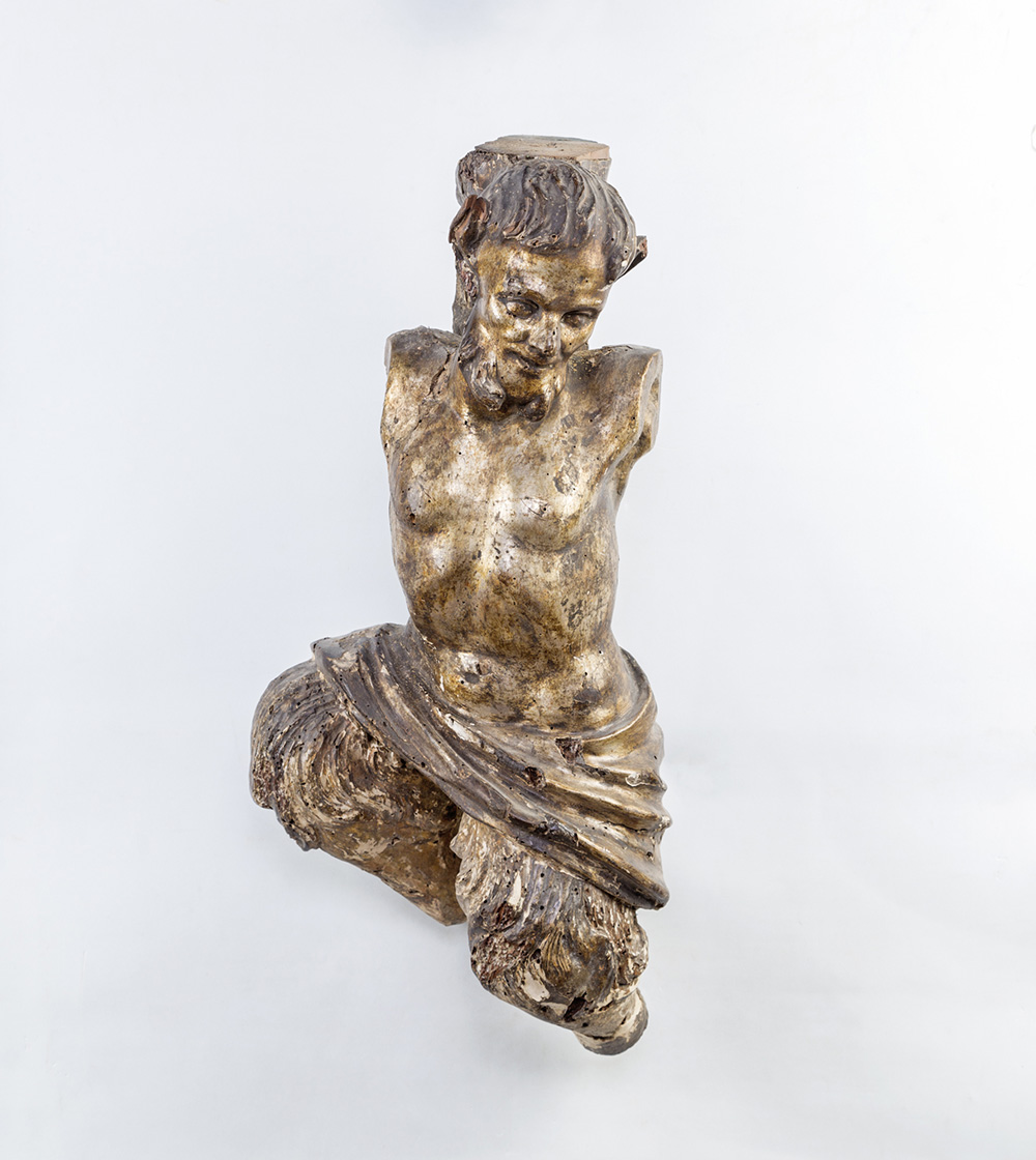 Lotto composto da quattro figure di telamone in legno dorato a mecca, scolpite a raffigurare satiri. XVII secolo, h cm 70 Difetti e mancanze.