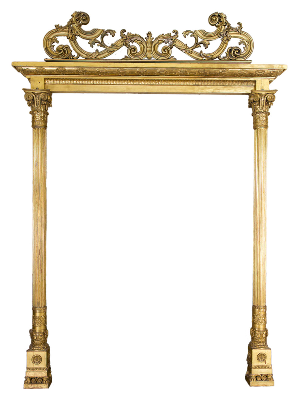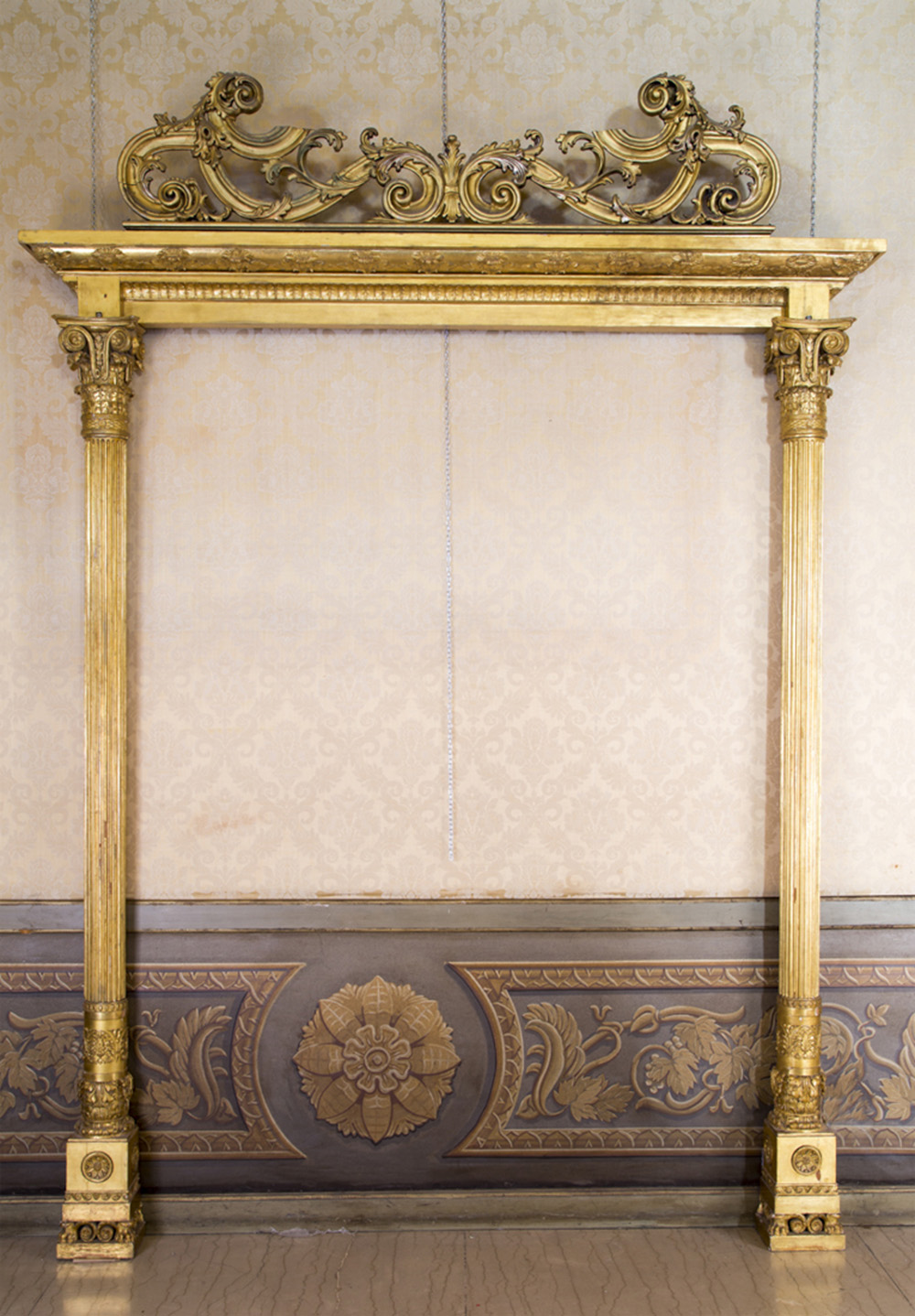 Portale in legno intagliato e dorato composto da due colonne a tutto tondo scanalate sormontate da capitelli corinzi, poggianti su basi a plinto ornate da medaglioni floreali stilizzati, con trabeazione di raccordo arricchita da palmette neoclassiche e elementi floreali e cimasa superiore a volute non pertinente. Misure: cm 320x218