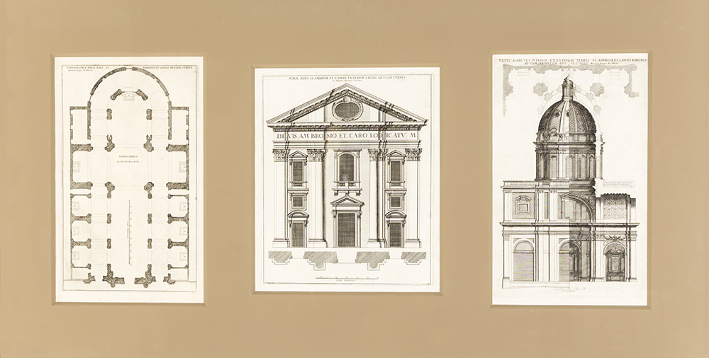 Tre acqueforti su carta bargellata, Chiese di San Carlo e Sant'Ambrogio al Corso, da Insignium Romae Templorum Prospectus, edita da Giovanni Giacomo de' Rossi, 1627- 1691, nella Stamperia di Santa Maria della Pace, Roma 1683. Misure: pianta: cm 41x25, facciata: cm 37x30; sezione: cm 41x25. Dimensioni totali: cm 61x118.