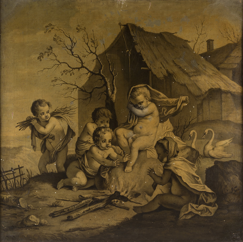Coppia di grisailles su tela raffiguranti Putti allegorici cm 96x98
