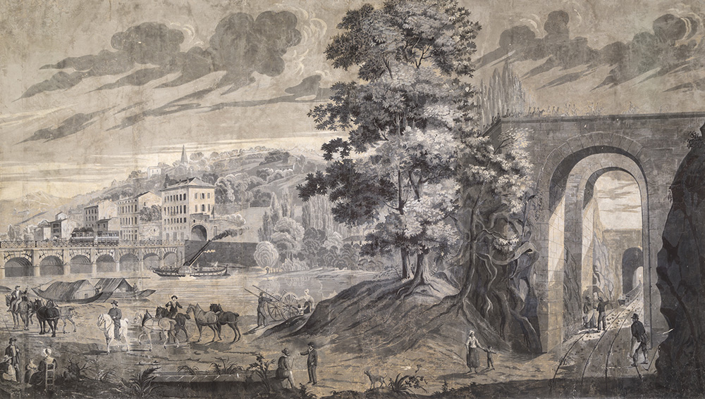 Grande grisaille "Paesaggio sul Rodano con figure" tecnica mista su carta applicata su tela, cm 345x205