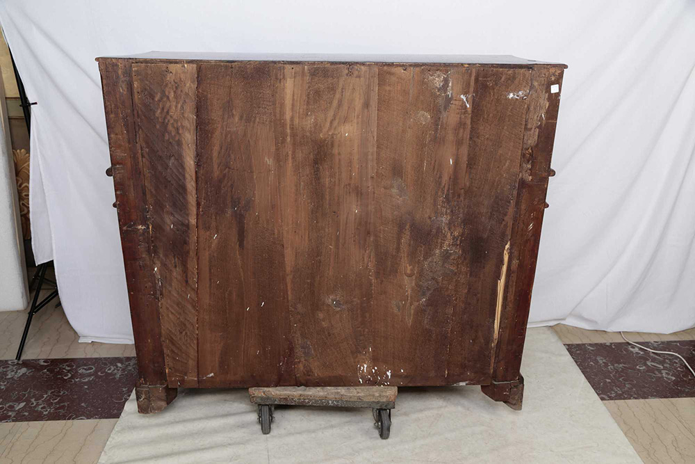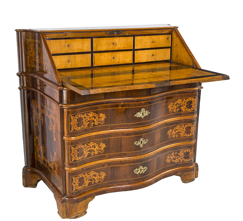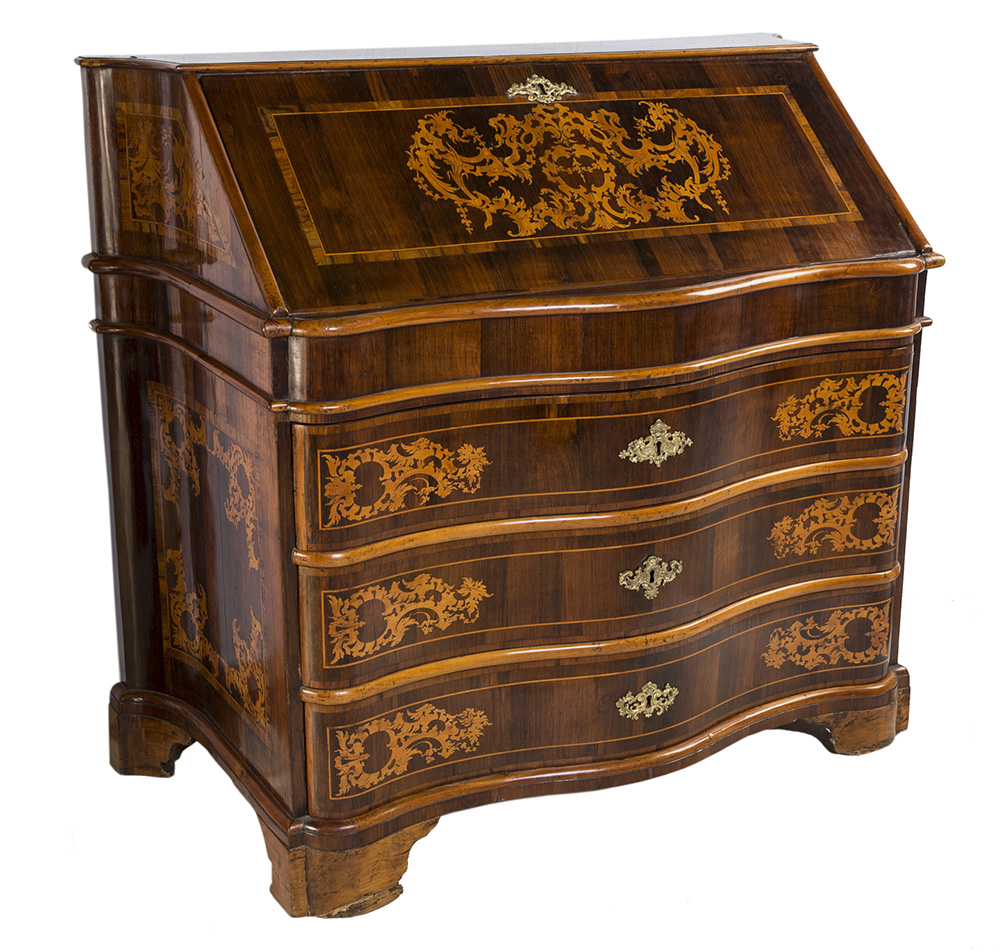 Cassettone a ribalta lastronato in noce, con specchiature racchiuse da filettature lineari poste a cornice di eleganti cartigli e motivi vegetali intarsiati in legno di frutto; sei tiretti all'interno della ribalta, facciata sagomata suddivisa in tre cassetti separati da traverse, fianchi mossi, piedi a mensola. Roma, XVIII secolo, cm 117 x 130 x 60