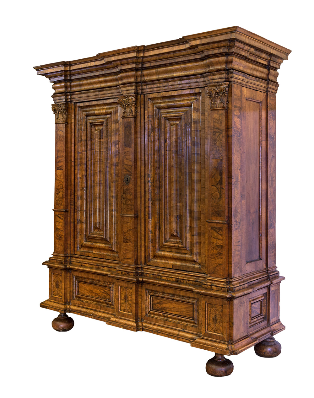Armadio lastronato in radica di noce caratterizzato da due ante delimitate da lesene con capitelli intagliati e specchiature incorniciate da più ordini di modanature concentriche. Sommità rifinita da un alto cornicione, piedi a bulbo. Olanda, XVII secolo, cm 231 x 206 x 84